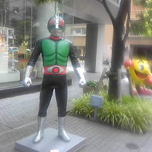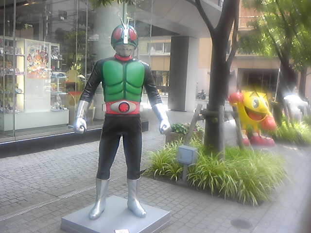 また、ビルの外側には、仮面ライダーなどのキャラクター人形が並んでいて、