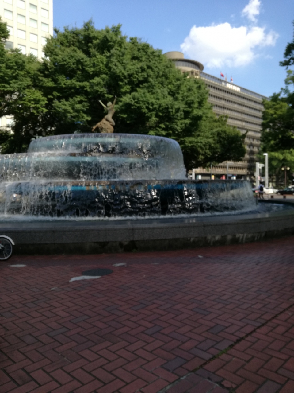 公園の真ん中に希望の泉という噴水があり、その波しぶきで涼が取れて気持ちよかったです。皆さん木陰で涼んでいました。今回はライブコンサートをされていましたが、以前来たときは物産展をしていたと思います。