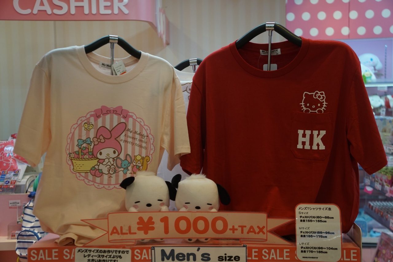 ハローキティショップは、キティちゃんのお店。キティちゃんは、サンリオがスヌーピーに対抗して開発した自社オリジナルキャラクターなんですが、思えばもう歴史が長くなってしまって、どっちが古いんだか分からないくらい。独特の淡いピンクのTシャツとか、お馴染みとなったキティちゃんのカラーです。