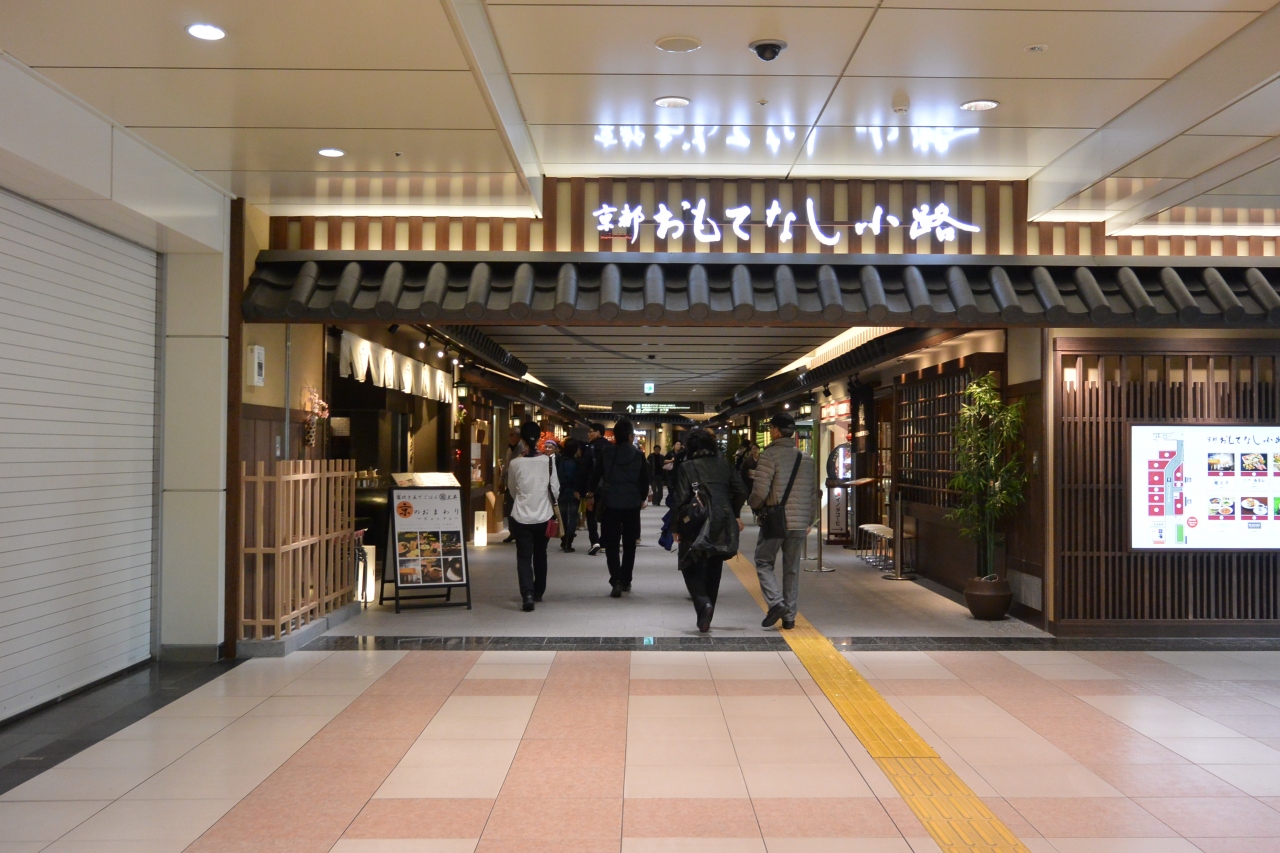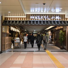 JR京都駅の八条口にある飲食店街です。瓦屋根や格子といった京都の町屋の造りでイメージを統一していて、照明もちょっと暗めで落ち着いた雰囲気。食事からスイ―ツまで京都の老舗が出店していて穴場的なところです。