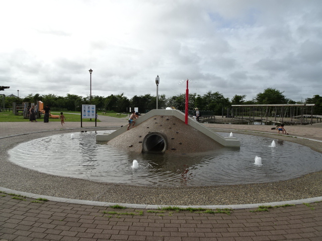 大きな池の周囲に遊歩道と公園が整備されています。ここの白眉はジャブジャブ池で、小さいですが噴水の出る滑り台とトンネルがあり、子どもたちは大喜びでした。隣には油断すると落下してびちょびちょになる水上アスレチックもあります。
