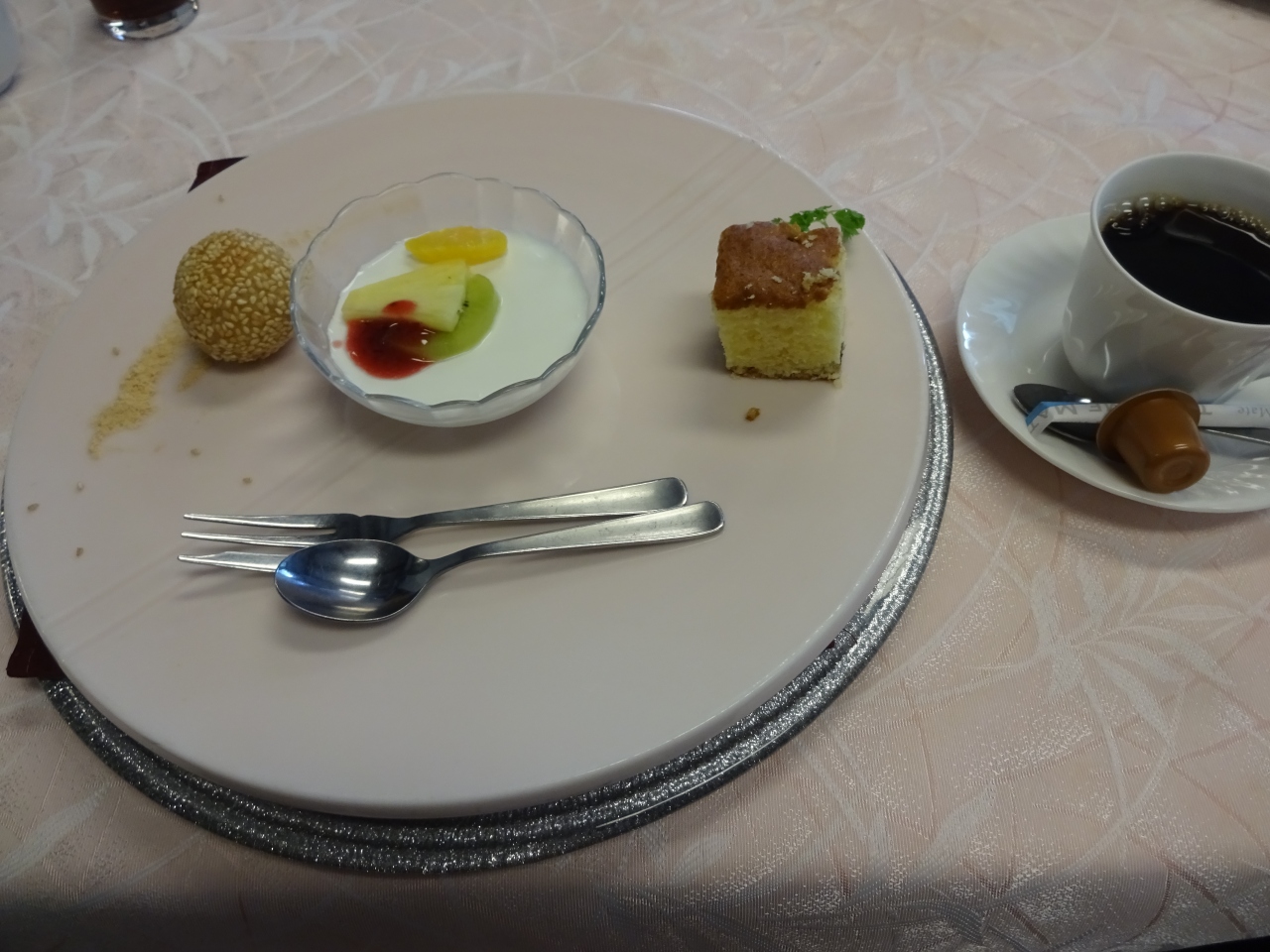 レディスランチは月替わりで⒎月はオードブル、薬膳スープ、エビと夏野菜の塩炒め、野菜と肉の蒸しパン包み、口直しのゼリー、冷やし担々麺、スイーツ、コーヒーだった。