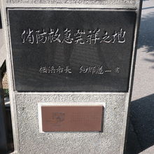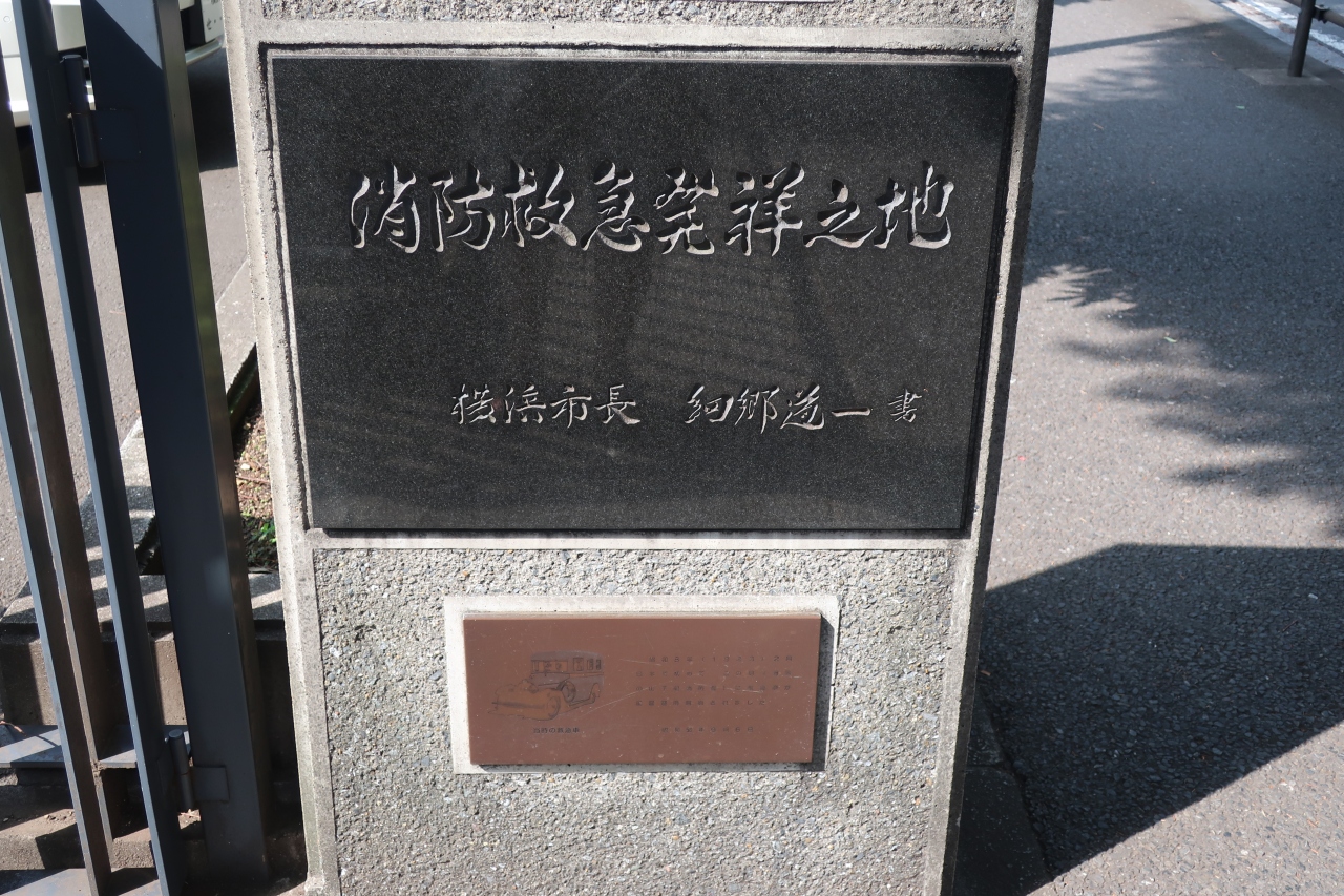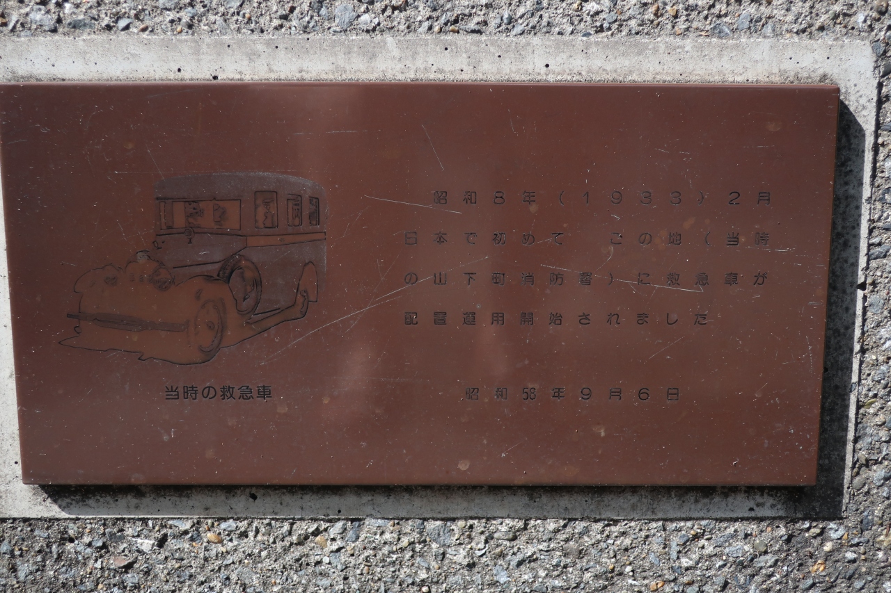 横浜都市発展記念館の裏の駐車場の一角にある地下貯水槽遺構と同じ場所に消防救急発祥之地の碑がある。居留地消防隊のあったこの場所は日本初の消防車や救急車が配置された日本の近代消防発祥の地です。碑の下には当時の救急車が描かれたレリーフがありますが、大したことは書かれておらず見ごたえは全くありません。