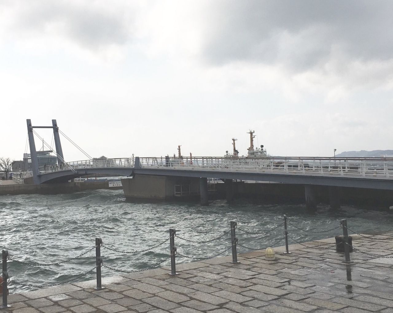 門司港レトロの中心になる門司港第一船溜の入り口にかかっている歩行者専用の跳ね橋です。門司港ホテル側から旧税関、展望室がある側に行く近道になっています。上にあがっていないときはただの通路ですので全く目立ちません。