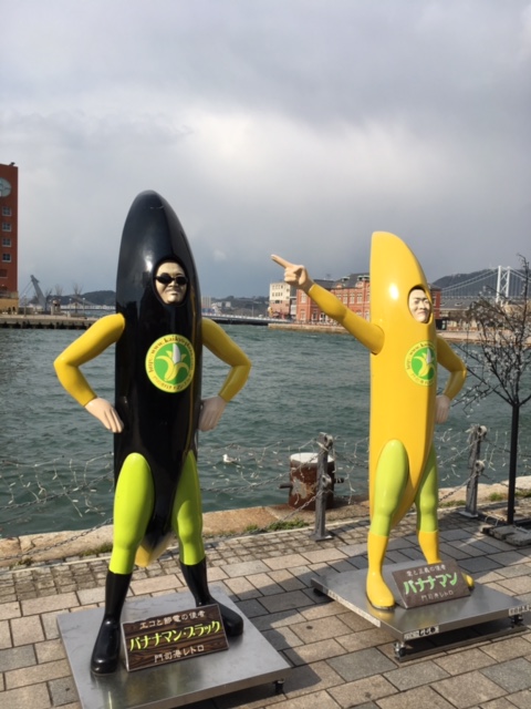 明治時代に台湾から船で運ばれてきたバナナが門司で鉄道に積み替えられたので、いたんだバナナの処分のためのたたき売りが門司港で始まったのだそうです。という由緒の割には何の変哲もない道端に地味な石碑が立っているだけなのです。観光客の多い船溜まりに面した海峡プラザの前にあるバナナ人形の場所とは違いますのでご注意ください。