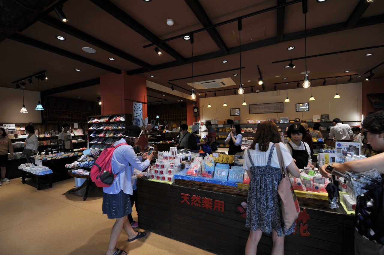 ツアーのコースで湯の花小屋の見学に来ました。大きなお土産屋さんが併設されていて、湯の花はもちろん、センスのいい和雑貨なども置いてあり、お客さんもいっぱいでした。