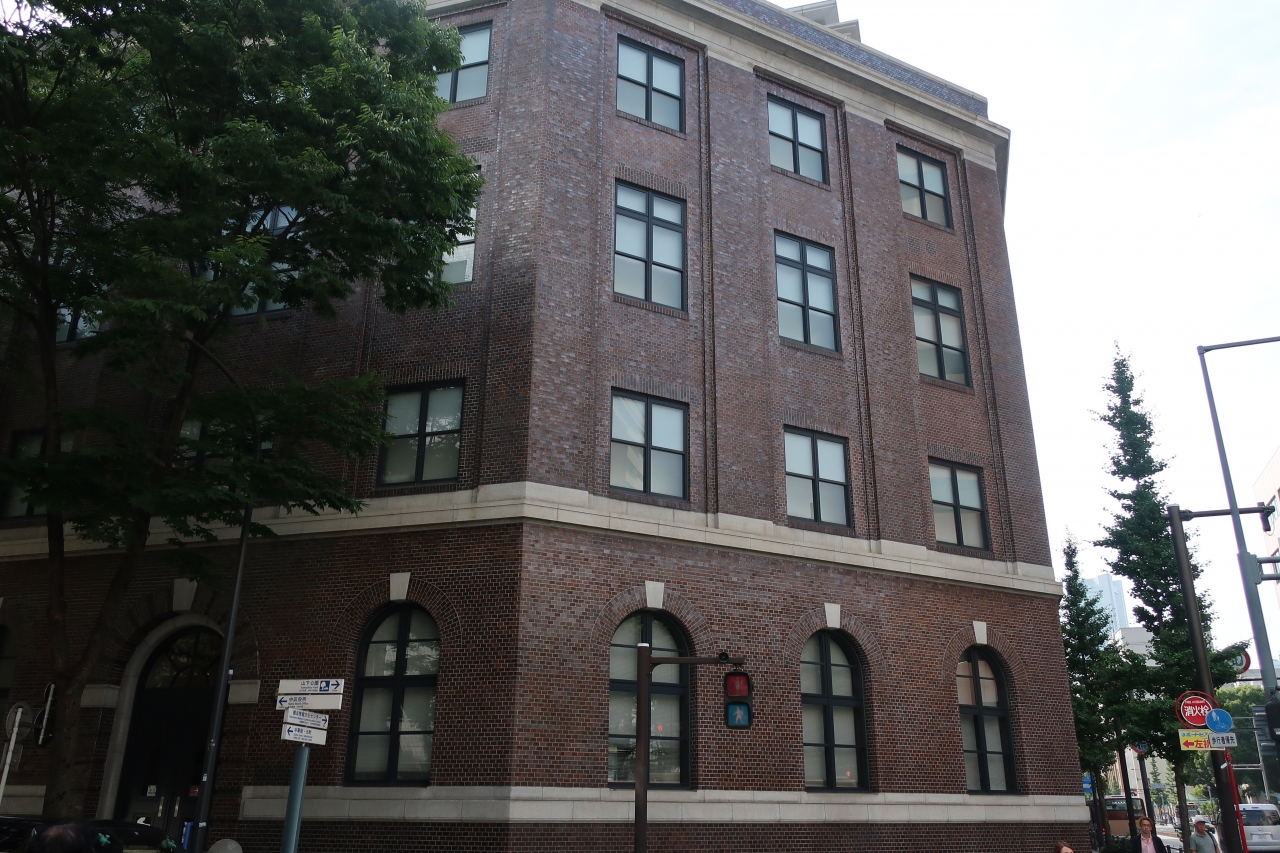大桟橋入口交差点の一角にある茶褐色タイルの昭和4年に建てられたレトロな近代建築が旧横浜市外電話局です。1階の窓はキーストーンのあるアーチ窓、2階より上は四角い窓など、古い建物はデザインが渋く、ある種ローマ建築をみているような渋い建物です。