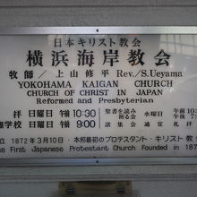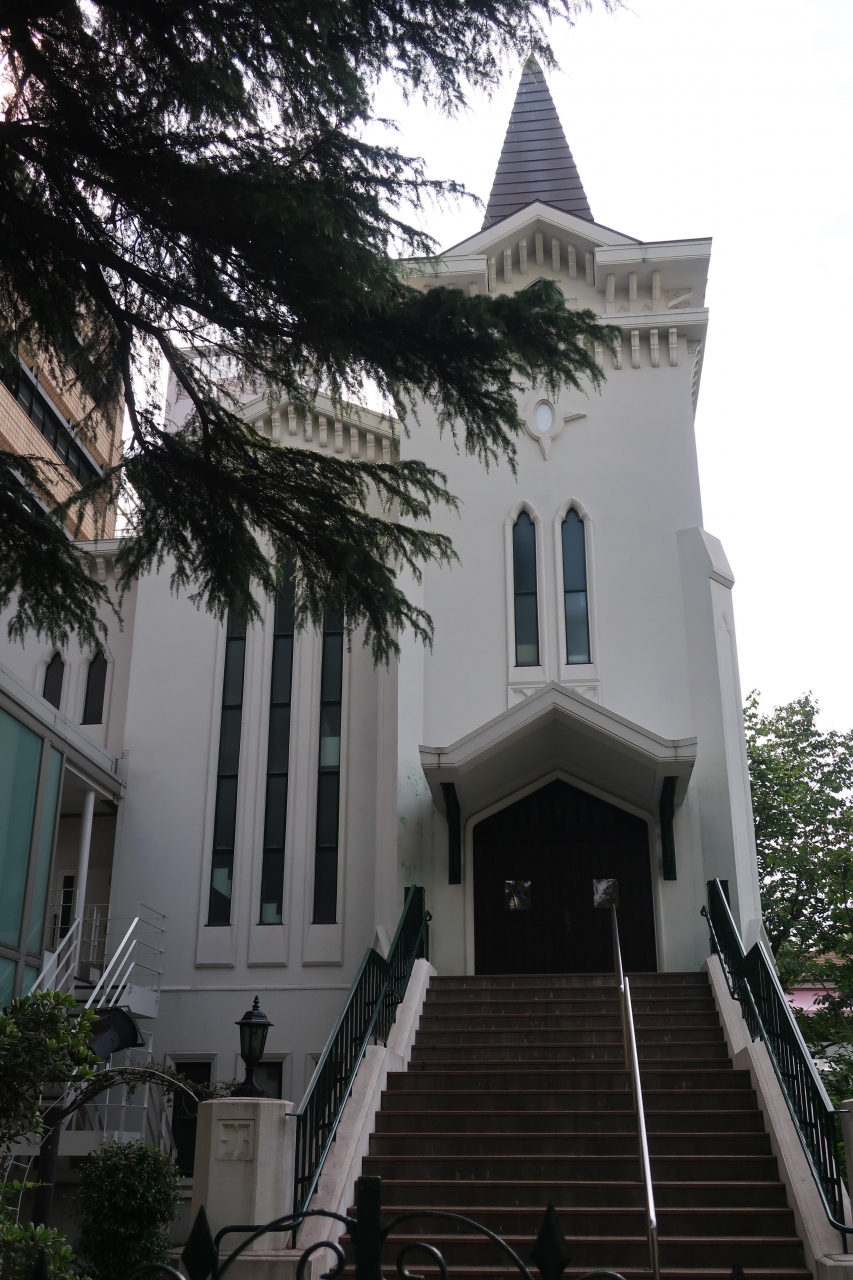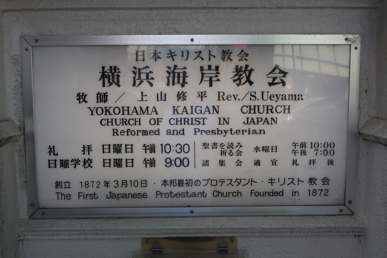 大桟橋通りぞいの開港広場の隣に三角形の鐘塔屋根をもつ白い教会がある。これが日本最初のプロテスタント教会と言われる横浜海岸教会です。内部見学もできるのですが、確認せずに行ったので教会外からの見学。内部を見学するならば問い合わせて行く必要があります。