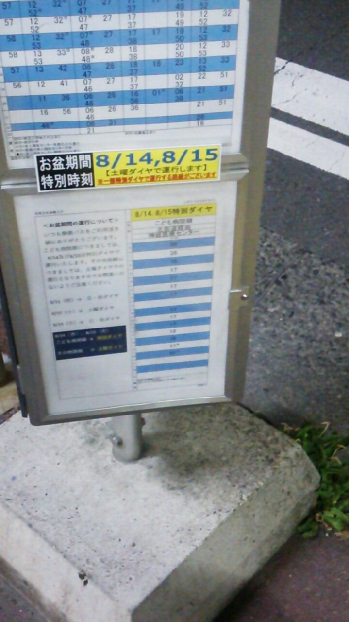但し2017年8月14日の月曜日と2017年8月15日の火曜日の2日間は通常であれば平日ダイヤでの運行となりますが、バス停の掲示によると日曜日ダイヤもしくはお盆期間の特別ダイヤでの運行となるそうですので、いずれかの日で利用予定の方は注意が必要です。