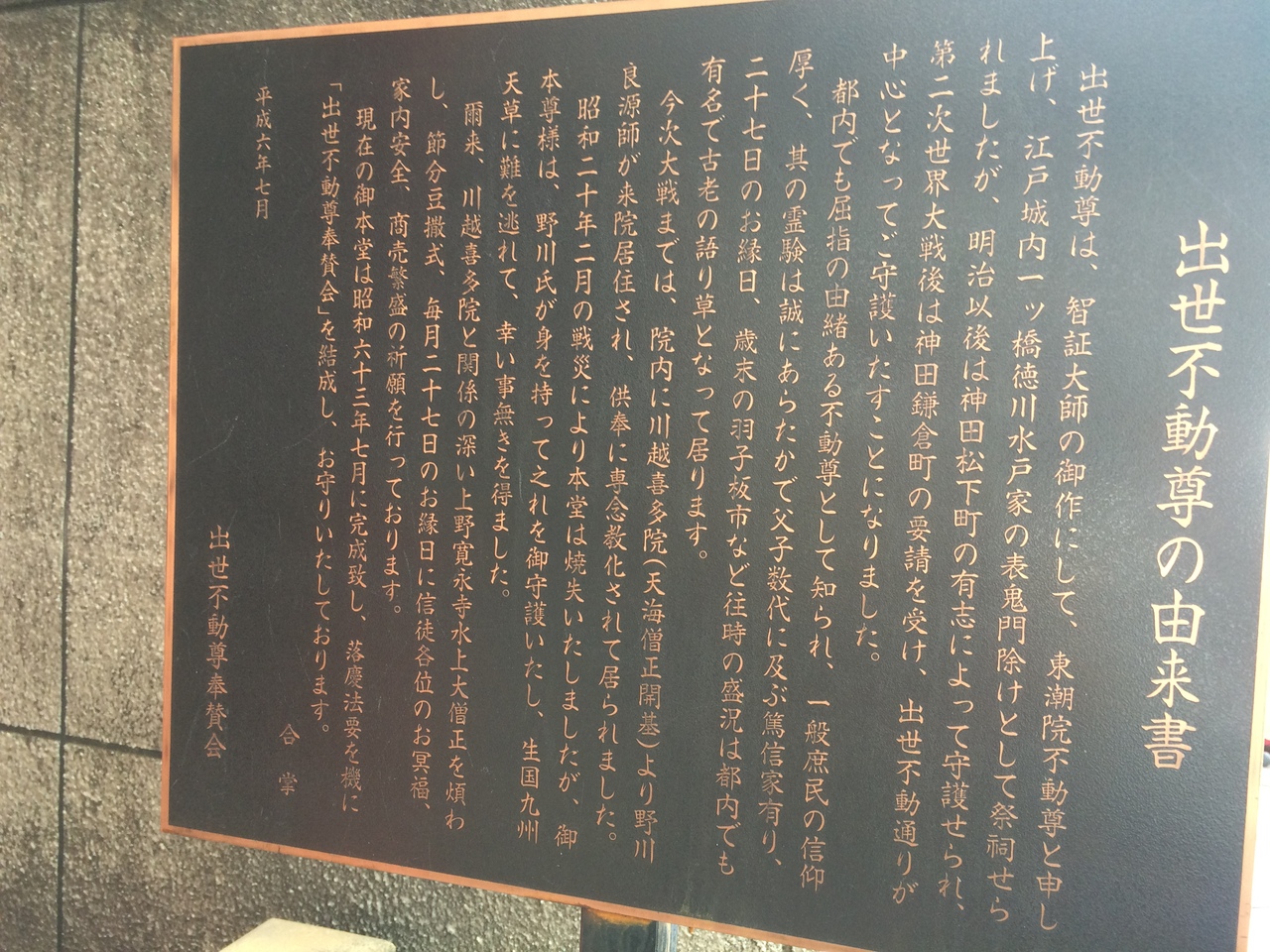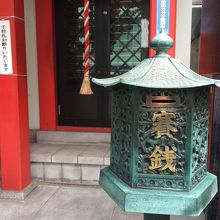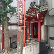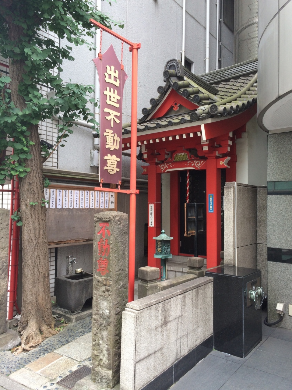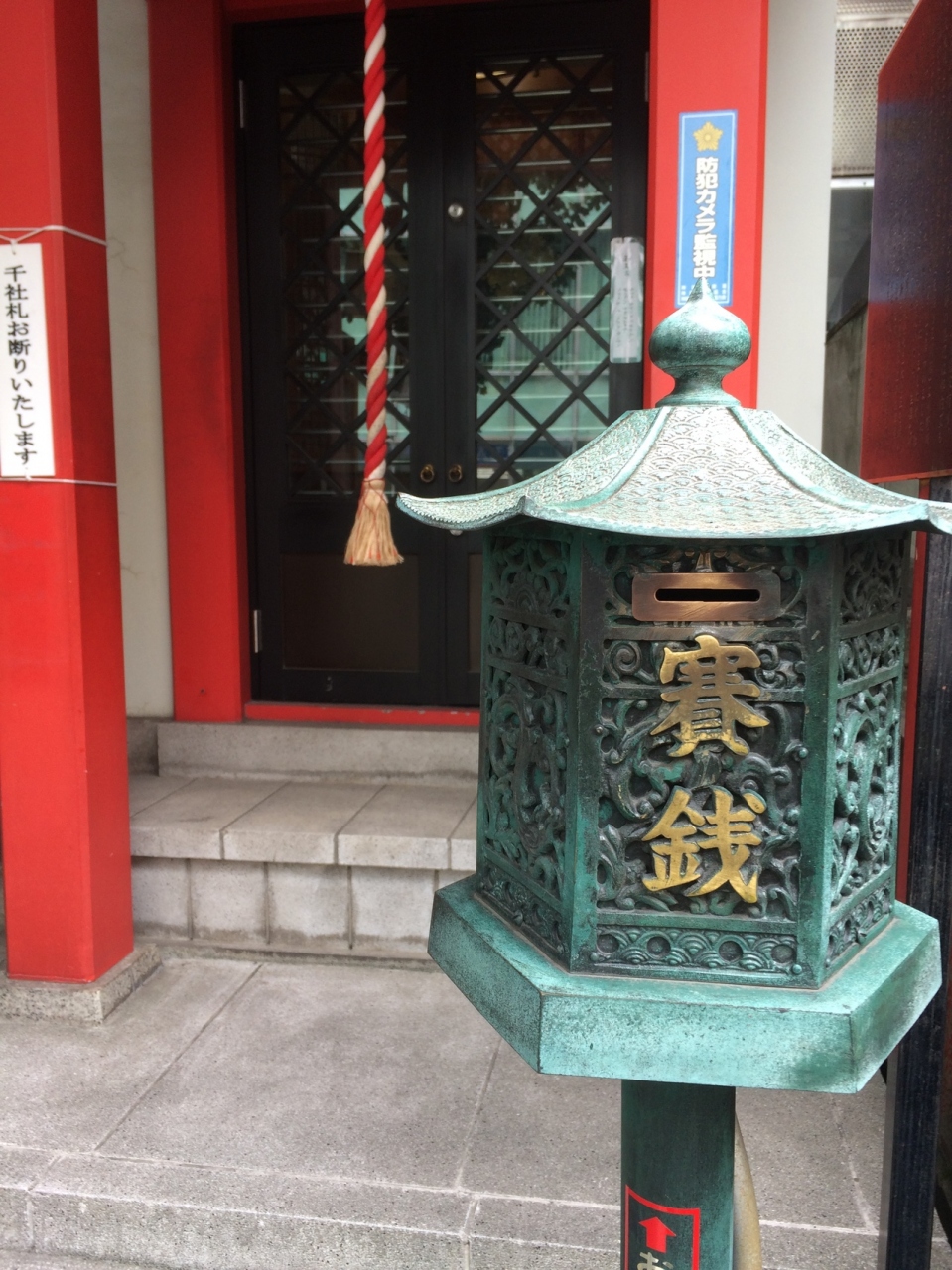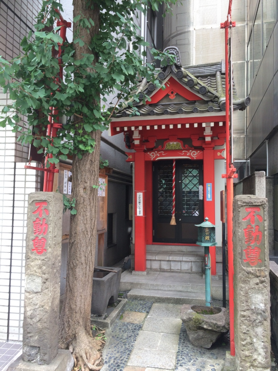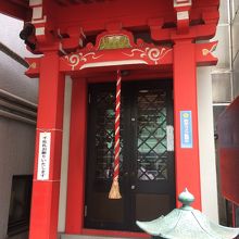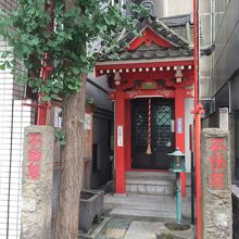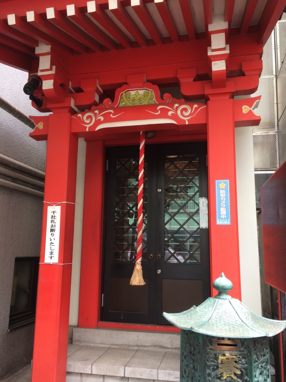 両隣のビルにぎゅっと挟まれたような景観で狭い敷地です。木、水洗い場、賽銭箱があるだけで建物は赤く、少し遠くからでも赤が目立つ建物でした。本堂は戦災により焼失、御本尊は九州天草で、無事ことなきを得たとのことです。