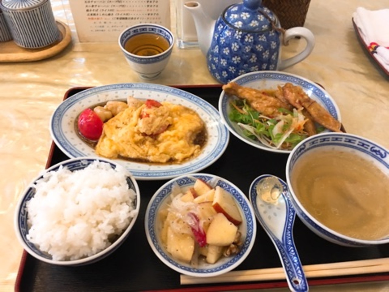 日替わり定食税込900円。お好み焼き屋さんでもあるので、玉子とエビトマト炒めは鉄板で調理されてます。味付けもいい感じ。女性のみスープにコラーゲンボール付きなのも嬉しいです。