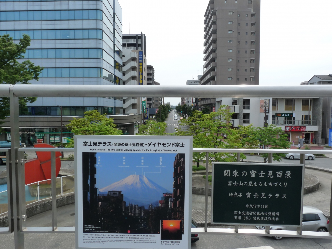 東久留米駅の駅舎にあります。東京への観光旅行で,ガイドブックにも乗っていた絶景を見ようと訪れたのですが,あいにく曇っていたので見ることができませんでした。運が良ければこのように見られるという写真だけは撮影してきましたので,皆様方も条件が良ければ訪ねてみてはいかがでしょうか。