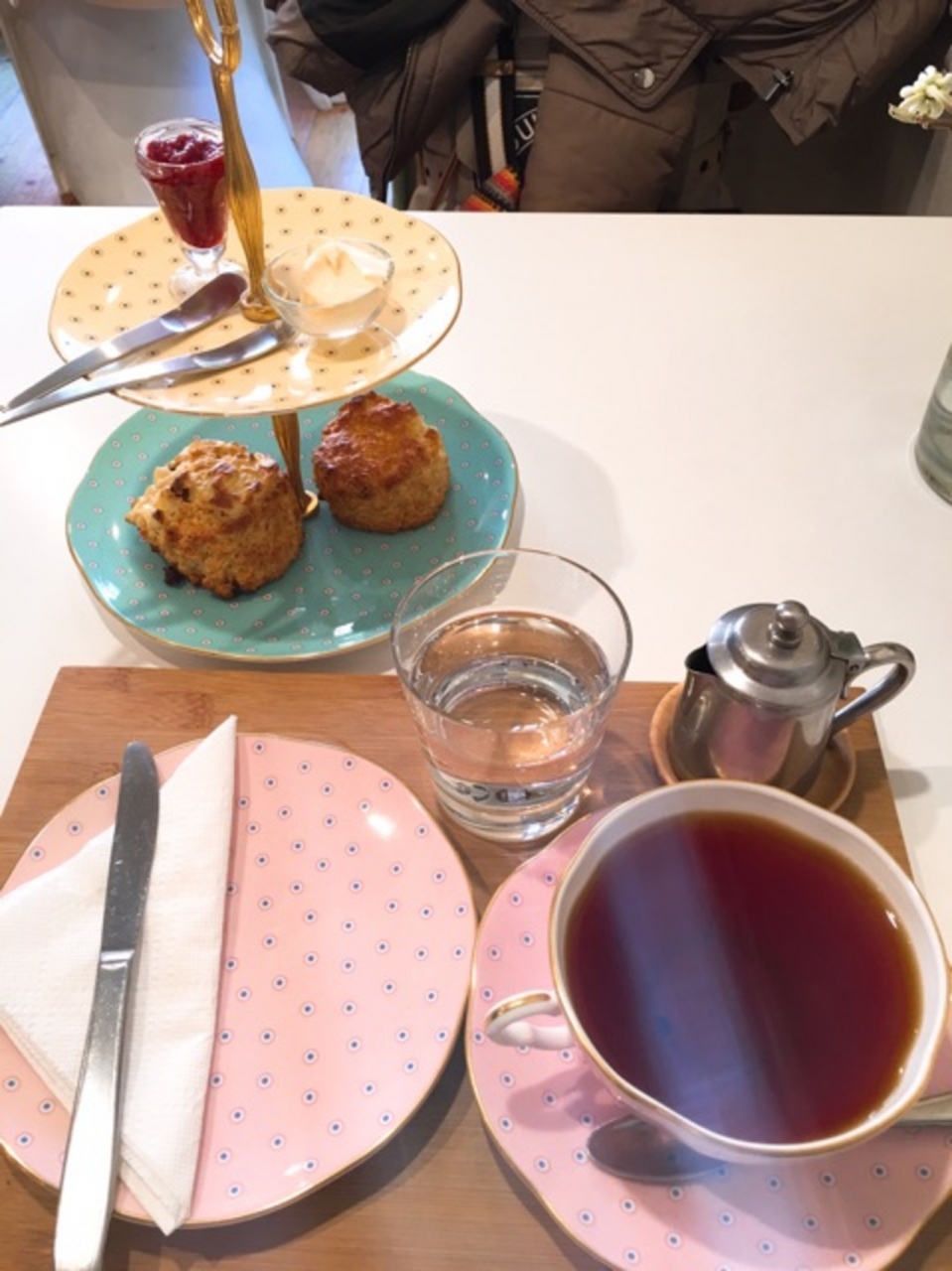 税込950円のセット。プレーンのスコーンにお好みのスコーンを選ぶことができます。私は季節限定のラムレーズンクリームチーズをチョイス。にいちごジャムとクロテッドクリーム、紅茶をチョイス。食器は全部ウェッジウッドです。