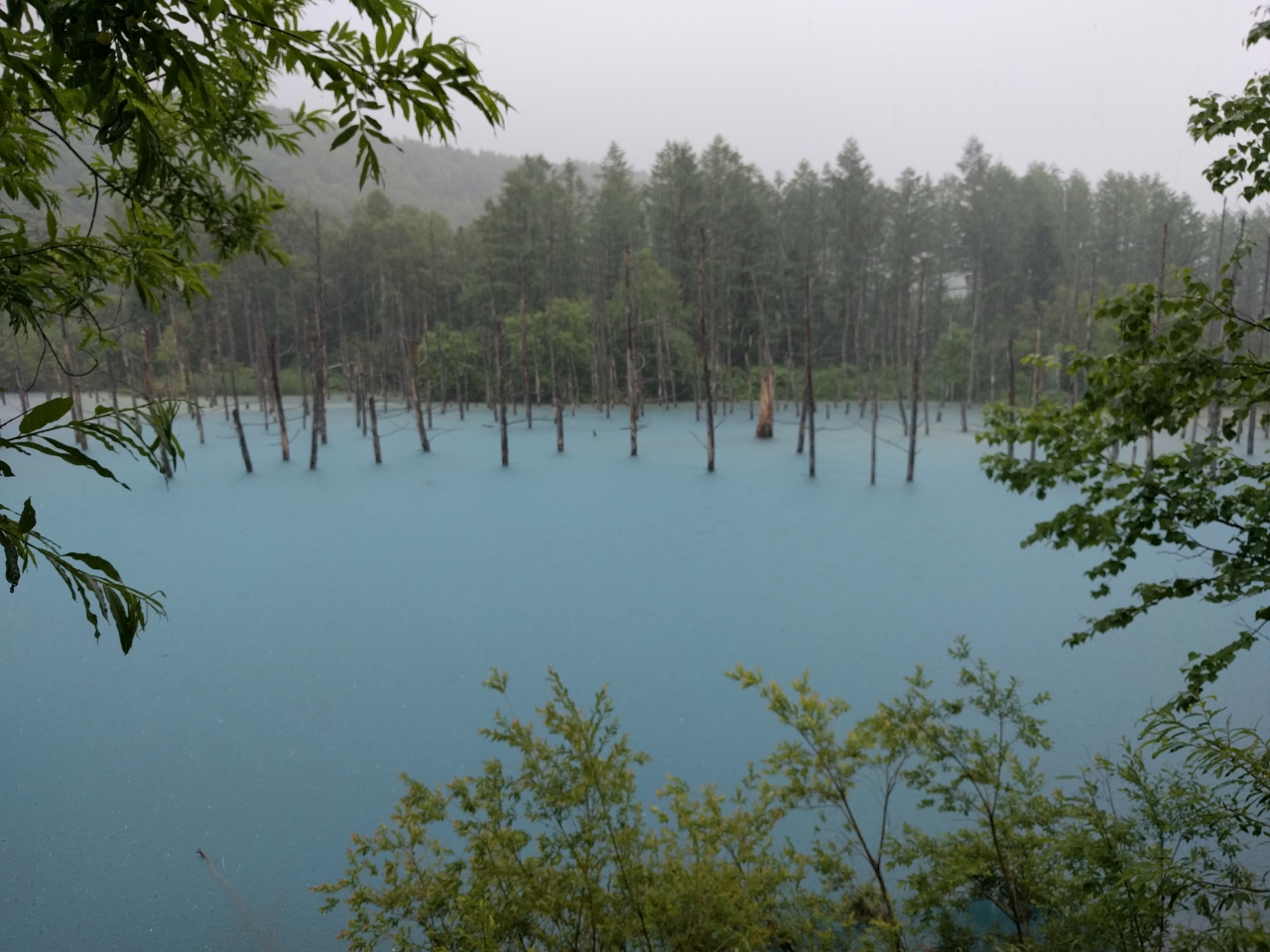 「美瑛(白金) 青い池」に行った。昼前に到着、バスが何台も止まり自家用車も多く、観光客で混んでいた。今流行りのフォトジェニックな風景が撮れるのもあるのだろう。外国人は自撮り棒持ってたな。天気が悪く、ここに着いたらより雨が激しくなり、写真を撮るので精一杯だった。ガイドブックの青い池と違ってたがきれいだったね。