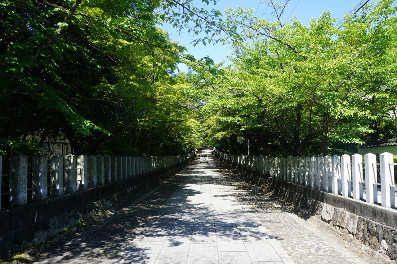 向日神社は、緩やかな登り坂の長い石畳の参道が見どころ。時々、車が通って危ないんですが、これを愛でながら歩くとは最高に気持ちいいですね。拝殿から本殿の構えも美しい。境内には山のアンギュレーションがそのままのようなところもありますが、それも含めて自然が豊かな感じがするのもいいところです。