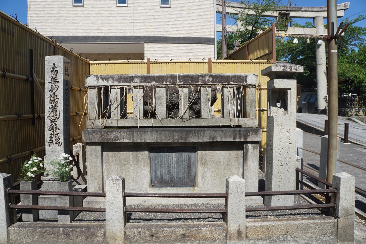 京での日蓮宗の布教活動を禁止された、日蓮上人の孫弟子、日像上人がこの石の上で西国街道を行き交う人々に説法をしたと伝えられる石。コンクリートの柵に囲まれて、おまけにしめ縄もある。厳重な扱いですが、それだけ影響力を与えた「事件」だったのだと思います。