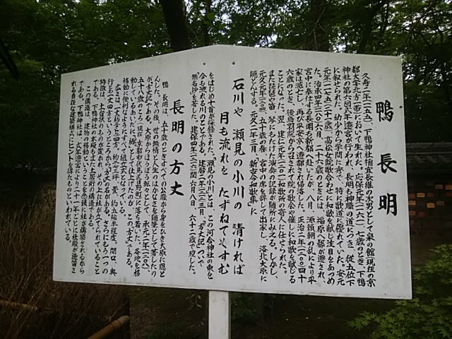 境内に、鴨長明が晩年に隠棲したという方丈が復元されたものが置いてありました。鴨長明は下鴨神社の禰宜の次男さんなんだそうです。