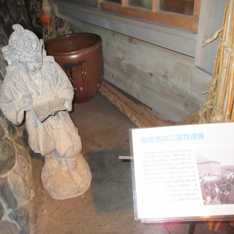 利尻島一周の道路は海岸沿い、海に沿って道路があり、内陸側はポツポツと民家があったりなかったり。喫茶店なんてありません。町立博物館は道路沿いに駐車場があって、休憩によい場所です。200円で動物たちの剥製や利尻で使われていた船、など、視覚的に楽しめます。ここにも二宮尊徳像がありました。