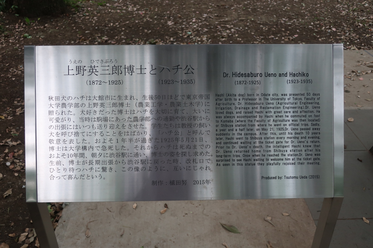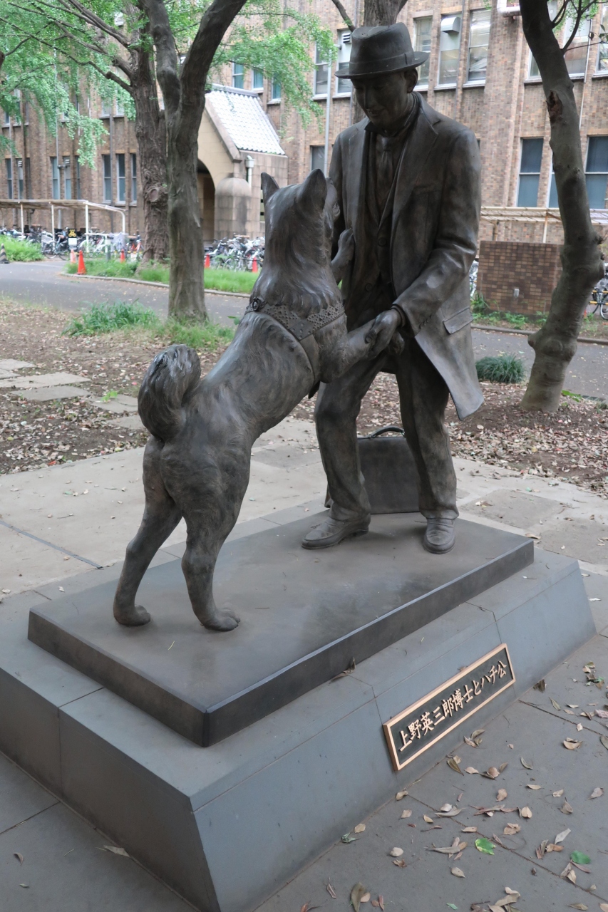言問通りを隔たて東京大学農学部弥生キャンパスの正門を入ってすぐ左手に「上野英三郎博士とハチ公」像があります。上野博士は農学部が駒場にあった時代の東大の教授でその縁でこちらに像がある様です。