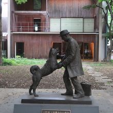 木立の中に建つ像は博士とハチ公が戯れ姿が描かれた割合新しい像です。渋谷のハチ公像は小さく、秋田犬には見えませんが、こちらの像は見るからに秋田犬。表情も可愛らしいです。