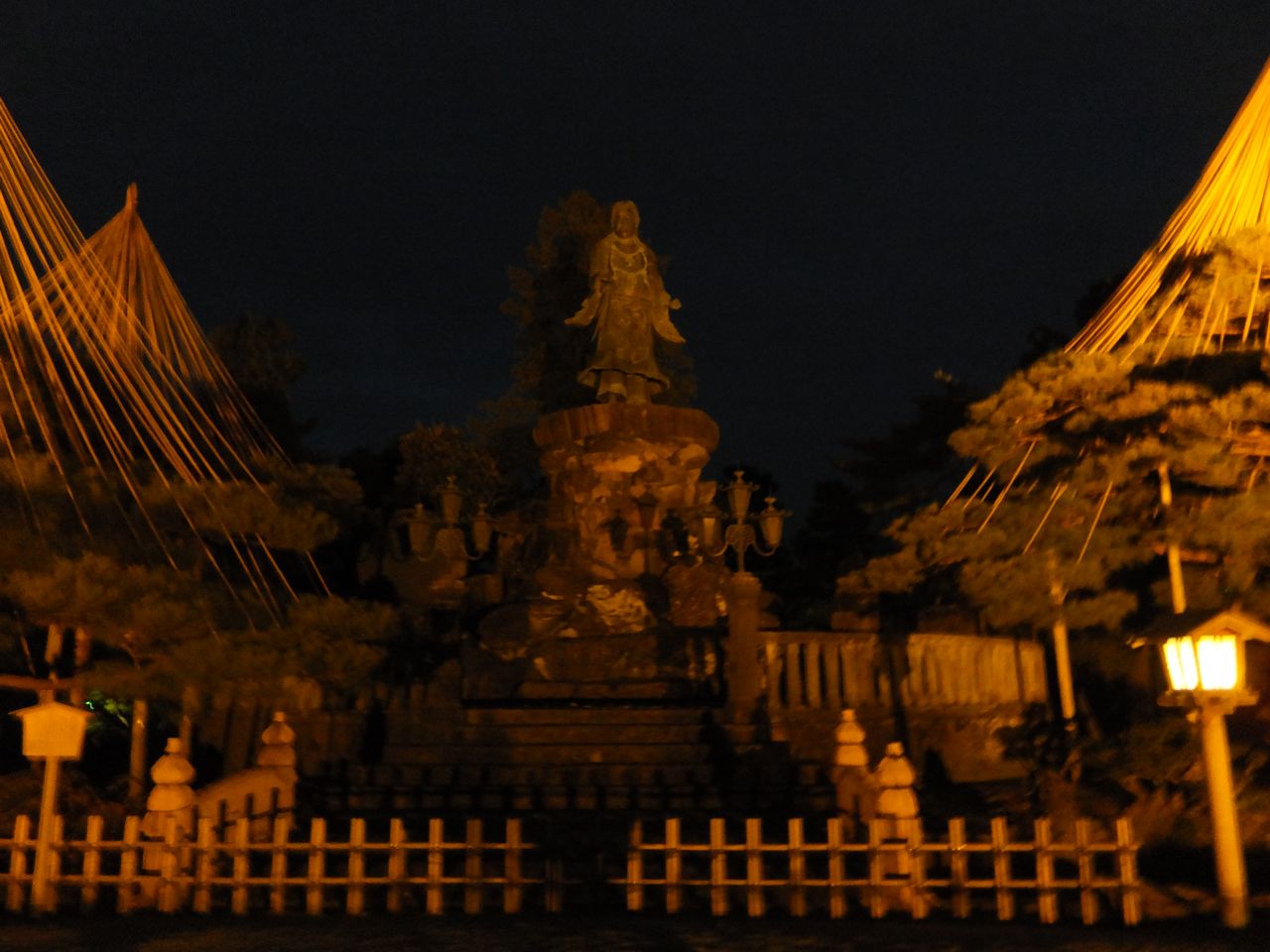兼六園の中ではちょっと異質な明治時代のもの。西南戦争のときの石川県出身戦死者の慰霊のために建てられたそうです。興味深いのはその造り。台座は7mくらいあると思うのですが、全部がセメントなど使わずに積み上げてあるだけなのだそう。屋外の人物の銅像としては日本最古のものだとのこと。当時でも兼六園という名勝の中にこれを造るのには何も異論がでなかったのかな、ということを感じました。兼六園でもここだけが明治のもの、ということで異質な空間です。そのためか、冬の夜間開園時に訪問すると両側の松の樹はきれいにライトアップされているのに、この像は暗く沈んでいました。そのため、「明治記念の標」と書いた石のまわりのなめくじ、大蛇、ガマガエル、の3すくみの石は確認できませんでした。