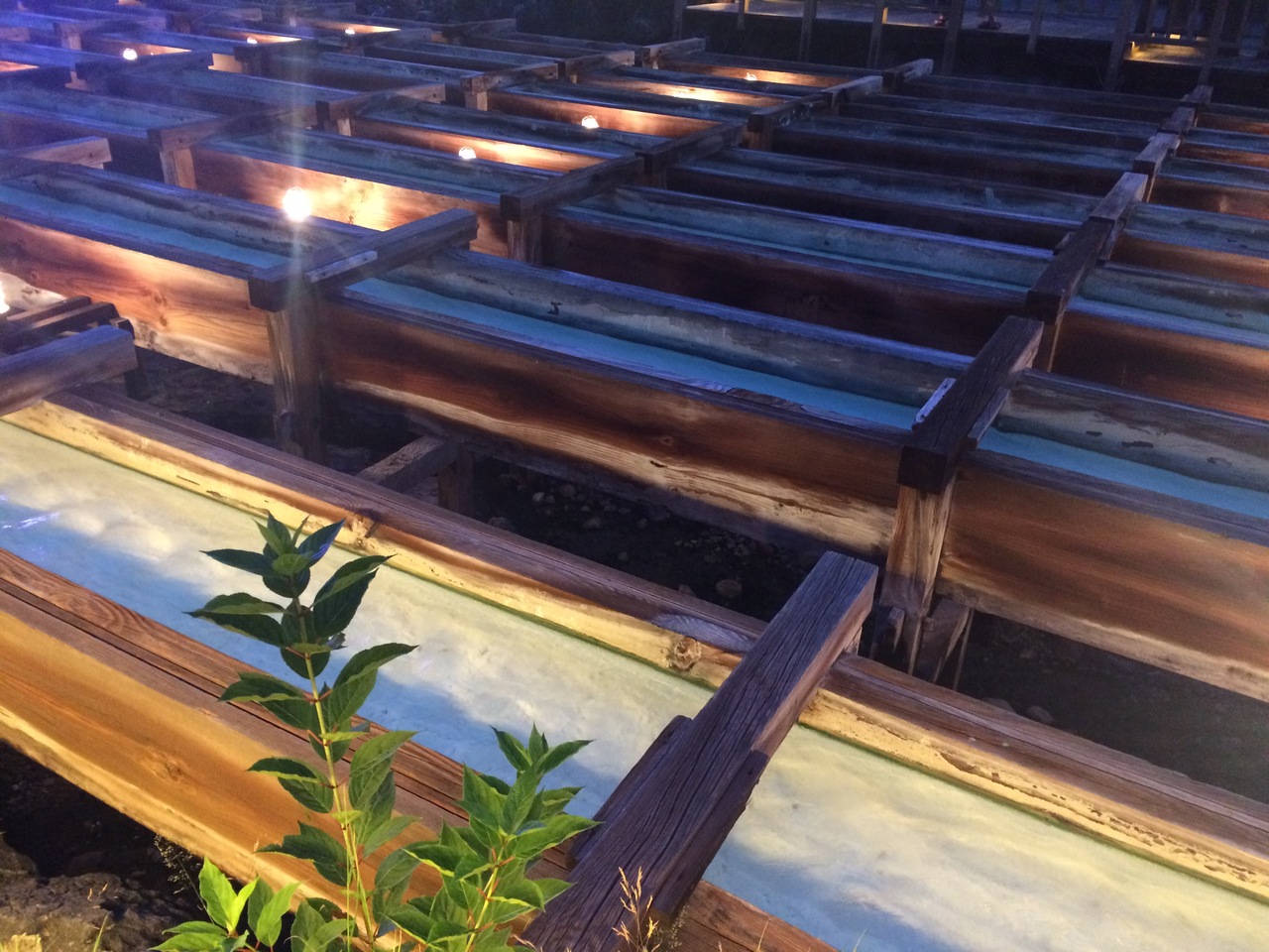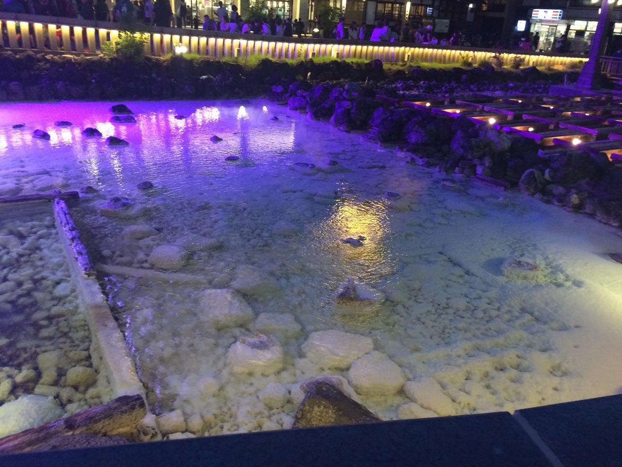 湯畑とはなんぞや、と実際見るまではわかりませんでしたが、こうやってお湯を冷ましているんだとわかりました。日が暮れると、黄色や紫にライトアップされて綺麗ですよ。夜になっても観光客で賑わっています。すぐ近くには足湯や居酒屋もあり、浸かりながら、飲みながらも景色を堪能できます。宿の夕食をなしにして近くの居酒屋で夕食をとっても十分満喫できるかと思います。また、近くには湯もみ体験・見学できる場所もあります。また、近くに焼き鳥を売っている店もありますが、私が行った際は美味しいのか行列でした。草津温泉に入った翌日は化粧ノリがめちゃくちゃ良かったです!是非群馬県の湯畑へ!!
