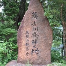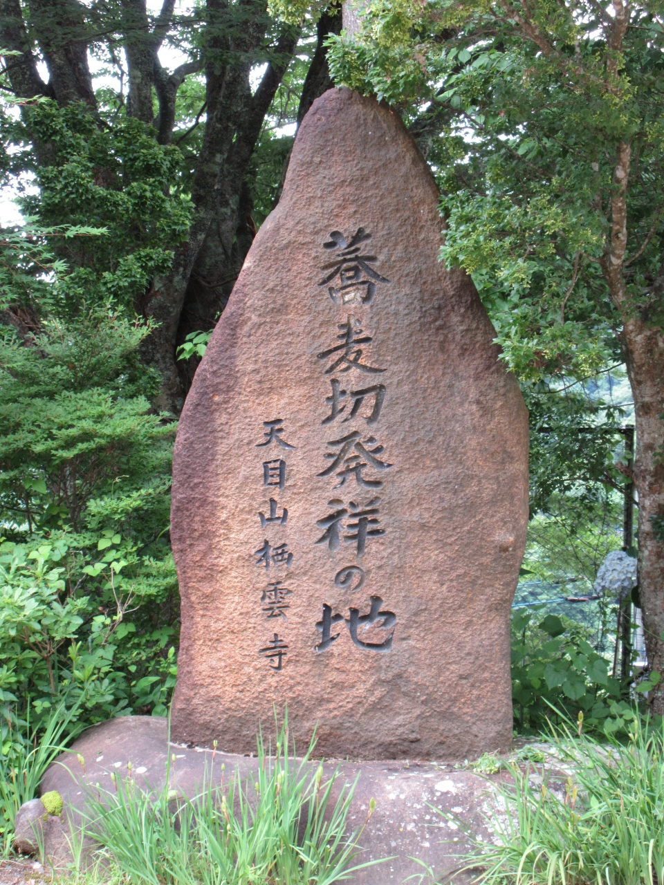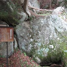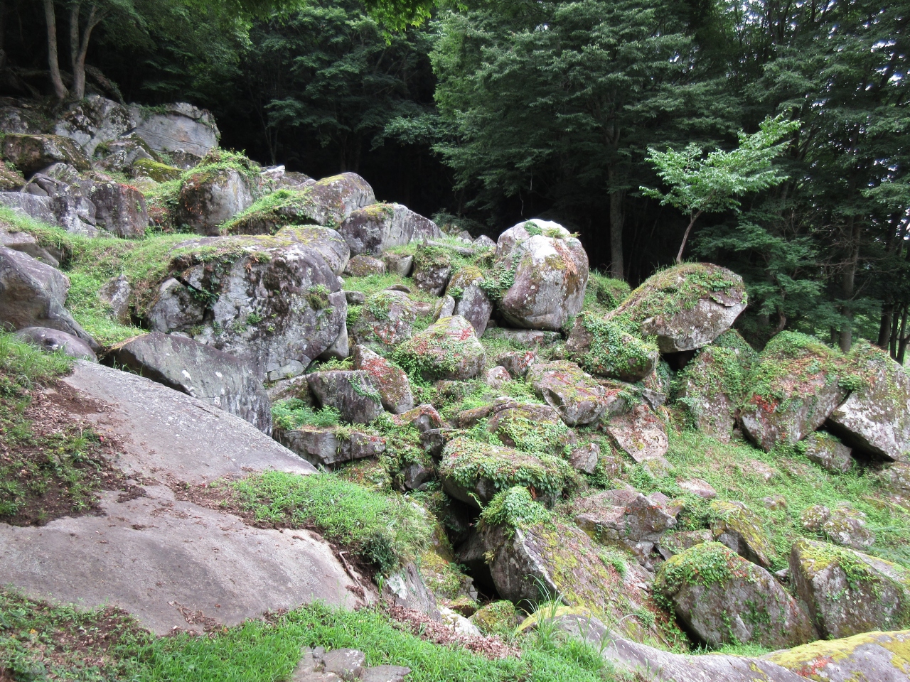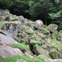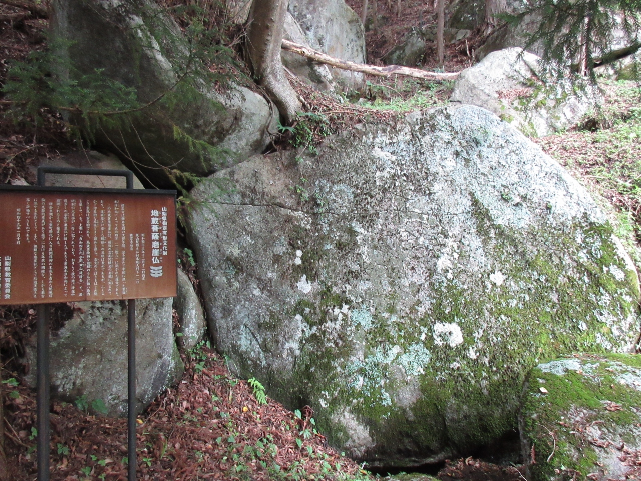 勝沼ICから20分ほど、舗装された山道を登った所に建つ栖雲寺本堂の裏にあります。庭園は巨大な自然石で作られていて、今でこそ庭園として知られていますが、かつては僧侶が石の上で坐禅を組んでいた修行道場でした。道場の奥にあった井戸から水を流し、石についていた土を洗い流し、土に隠れるようにして置かれていた石の表面を掘り出し、庭園として整えたとのことです。石には摩崖仏も描かれています。寺には武田本陣の軍旗や軍配なども保存され、特定の日だけ拝観できます。また蕎麦切発祥の地でもあり、毎年11月には蕎麦がふるまわれるイベントが行われます。