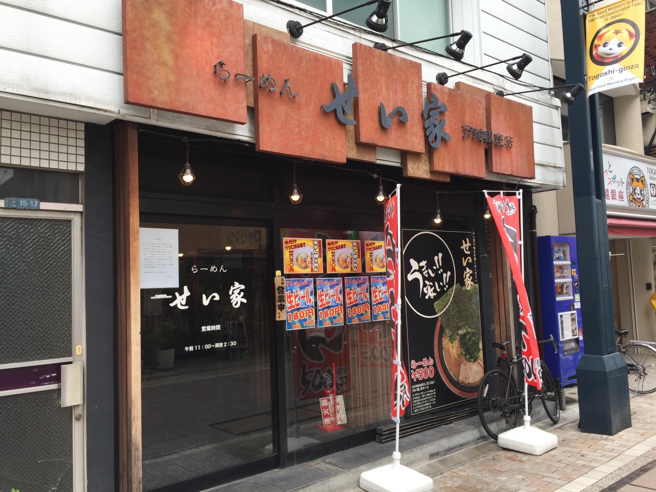 チェーン展開している安さが魅力のせい家です。こちらはその戸越銀座店。商店街の途中にあります。ラーメン一杯500円。小腹が空いた時に、安さに惹かれて入店してます。味は家系でしょうか。500円にしては美味しいと思います。チャーシューも入っているし、海苔が豪快です。