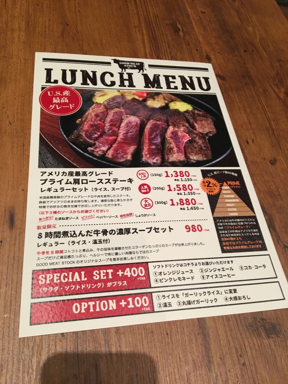 日曜日のお昼に伺いました。オフィスエリアなのでとても空いています。プライムビーフのステーキランチをオーダー。レアの状態で運ばれてくるので自分の好みの焼き加減で頂きます。200グラムしっかり食べられて満足でした。