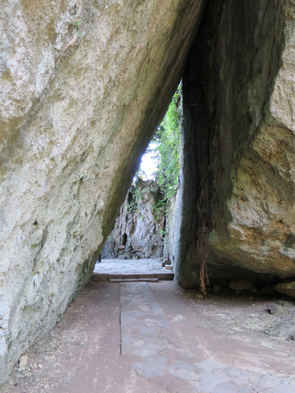 いくつかの拝所を経て、10分ほど先に三庫理(さんぐーい)に着きます。大きな岩と岩が支え合って、三角形の空間を作っているところ。