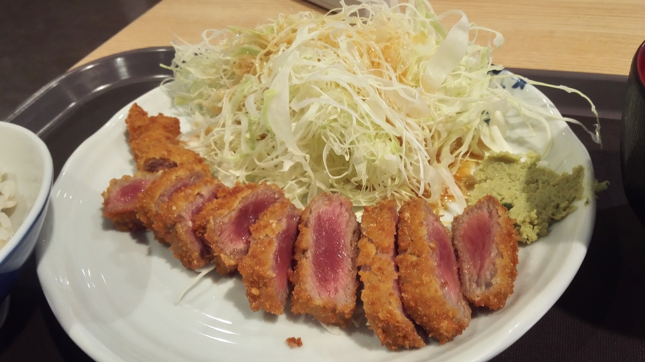 さすがにちょっとお高いか。。。写真で見るサイズは1000円突破します。味は「なるほど、ミディアムレアの牛カツ、なるほどね」と思います(笑)。つけダレは美味しいです。イオンモールの中ではさすがにちょっとお値段が高いので二度目はないかなー。。。