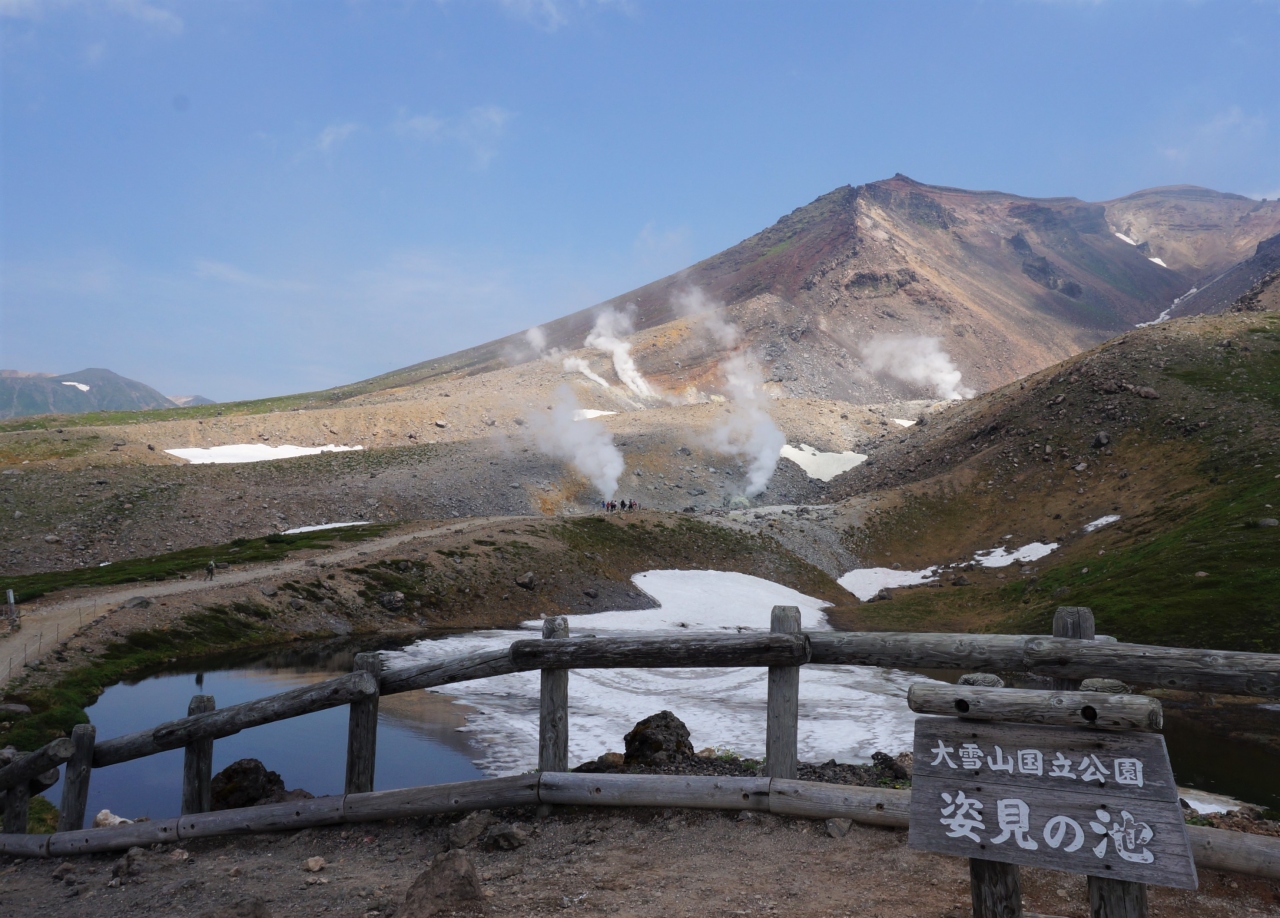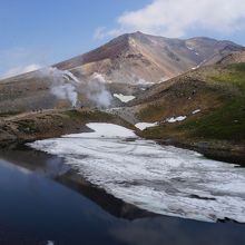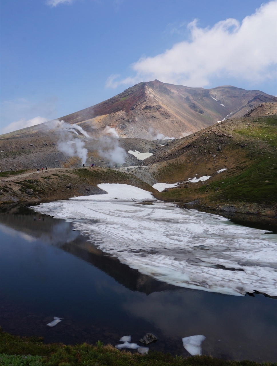 旭岳の姿を映す姿見ノ池も半分は雪に覆われ、映る山も山頂のみ。
