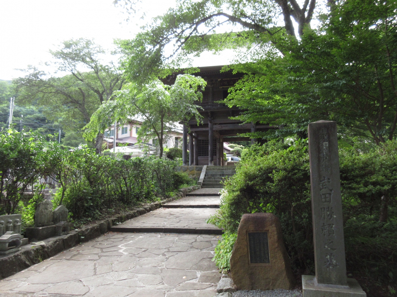 甲州市にある武田家ゆかりの寺巡りに出かけました。勝沼ICから車で10分ほど日川渓谷を北上した斜面にある曹洞宗寺院です。武田勝頼、北条夫人、武田信勝が自害した生害石や墓があります。山門は境内の中で唯一当時の姿を残すもので、風情があり見ごたえあるものです。山門の周りに桜の大木があり桜の時期には山門との景色が美しいであろうと想像できます。訪れた時は色鮮やかなあじさいと香り豊かなゆりが咲いていました。武田勝頼の母の墓がある小坂観音院のあじさいが今年ほとんど咲かなかったことを思い出しました。武田信玄の墓所がある恵林寺から離れていますが、武田家に興味のある方におすすめします。