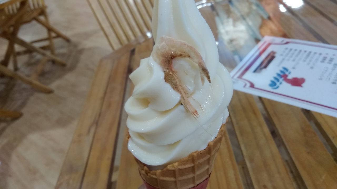 今回は食事を済ませてから寄ったのですが、きれいなレストランをはじめ食べる場所がいくつかあったので、ここで食べればよかったかな、と思いました。暑かったので白エビソフトを買ってみたら、エビがのっていました。アイスの中にもエビ成分が入っているそうです。
