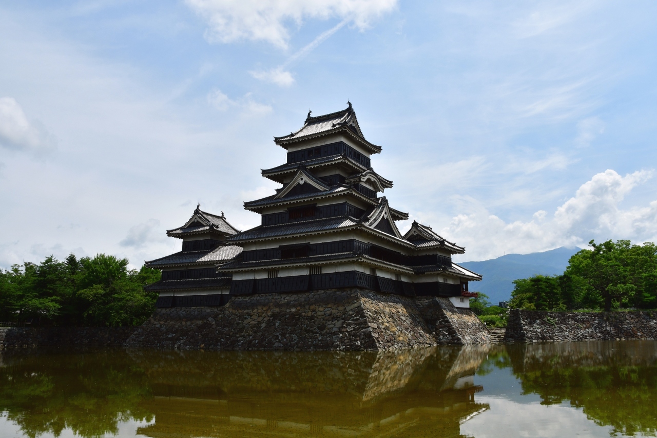 国宝松本城天守がそびえる公園。元本丸・二の丸・三の丸から成る。天守を眺めるには、有料の本丸に入るより、外の濠から望むのがベター。それだけなら無料。天守に上がるには、有料である本丸に入る必要が。そこで、場合によっては90分待たされた上で漸く天守へ通される。以前は本丸へは南側と西側から入れたが、2017年に訪れた時は南側のみとなっていた。