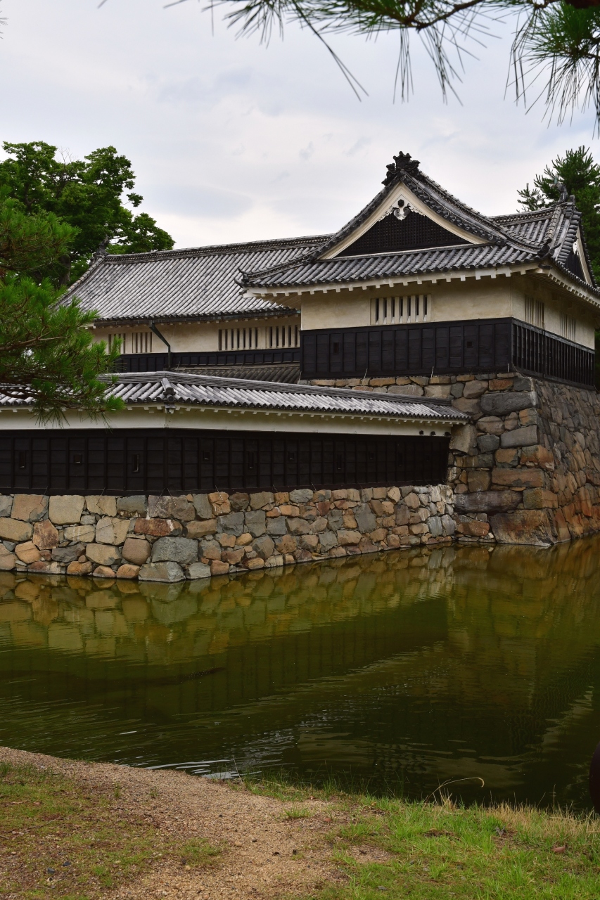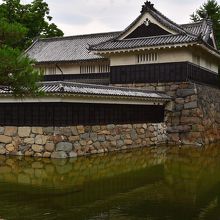 松本城本丸跡に復元された櫓門。以前は、本丸へ通じるいくつかの入り口の一つだったが、2017年現在は、一般利用客が本丸を出入りするのに使える唯一の出入り口となっている。現存天守と同様、下見板張りとなっていて、城全体の雰囲気とマッチ。櫓門だが、中には入れない様である。