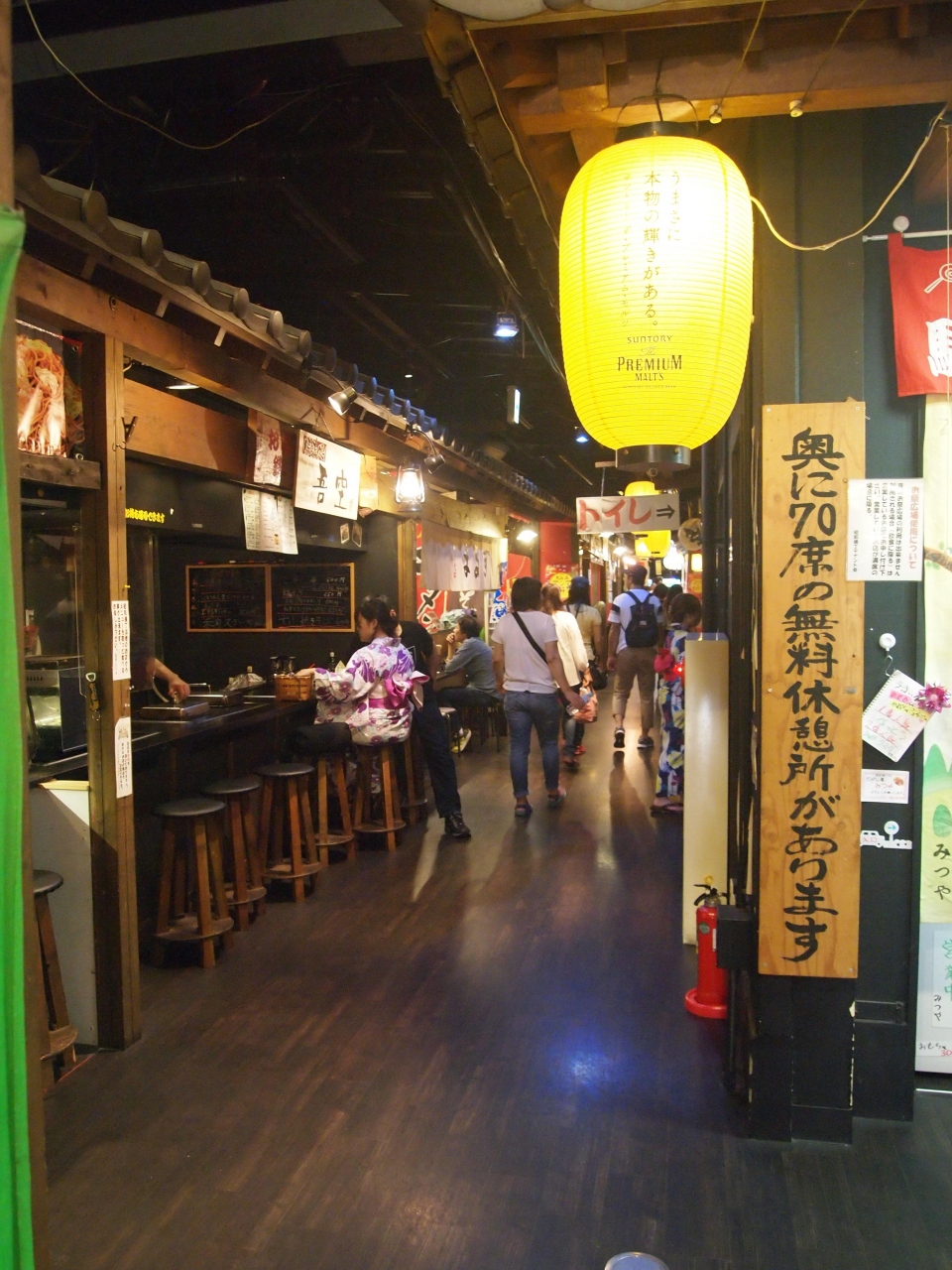 本町通りに面してあります。どんでん館の向かい側です。昔の町割りの敷地をそのまま利用したようで、間口は狭いけど奥行きはかなりあります。両側に小さな屋台というかカウンターの店が並んでいます。好みの食べ物を注文してカウンターで食べるか、テイクアウトして奥のテーブル席で食べることもできます。入り口の団子屋さんが人気のようで混雑しているように見えますが中はそれほどでもありません。