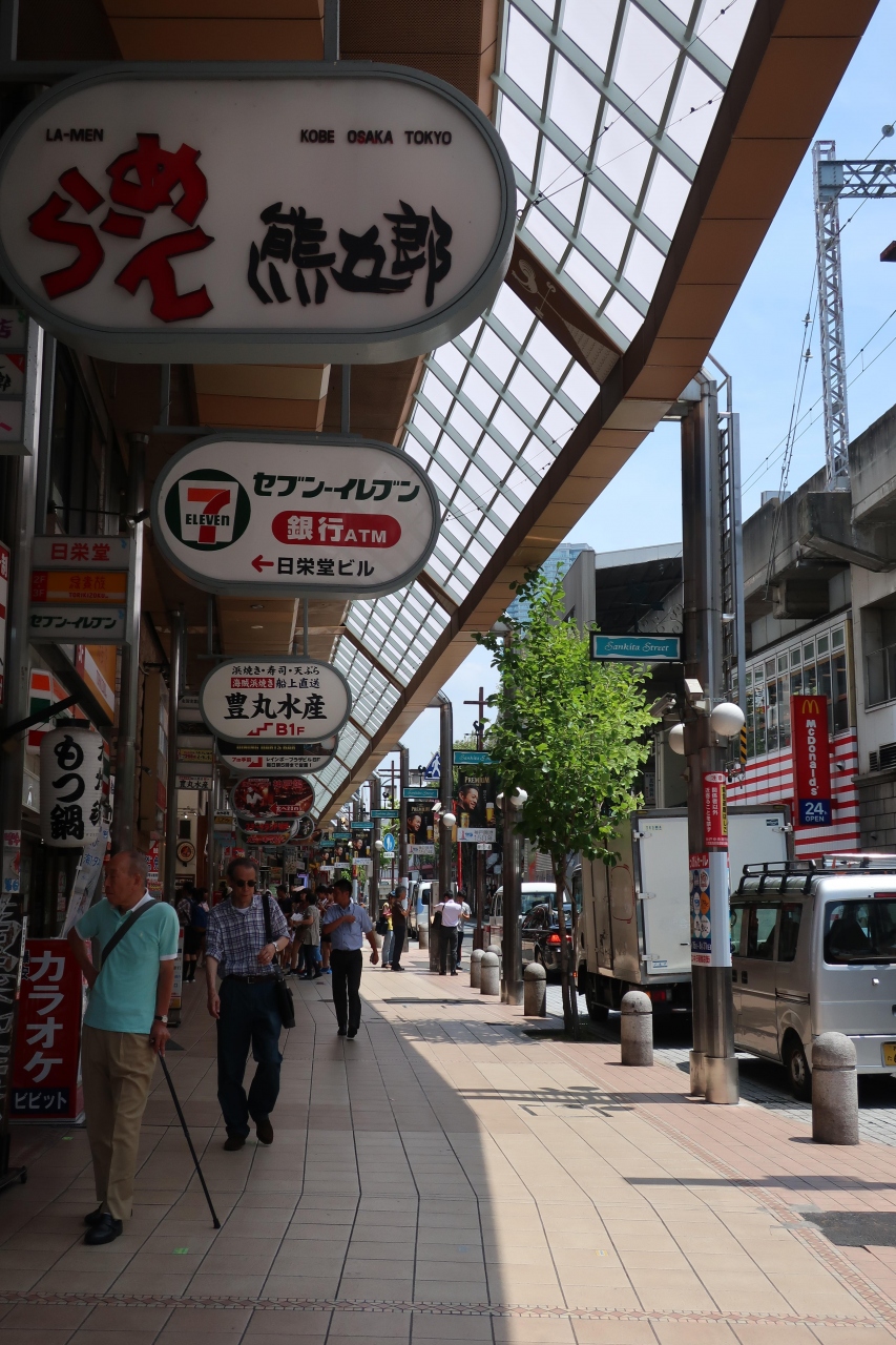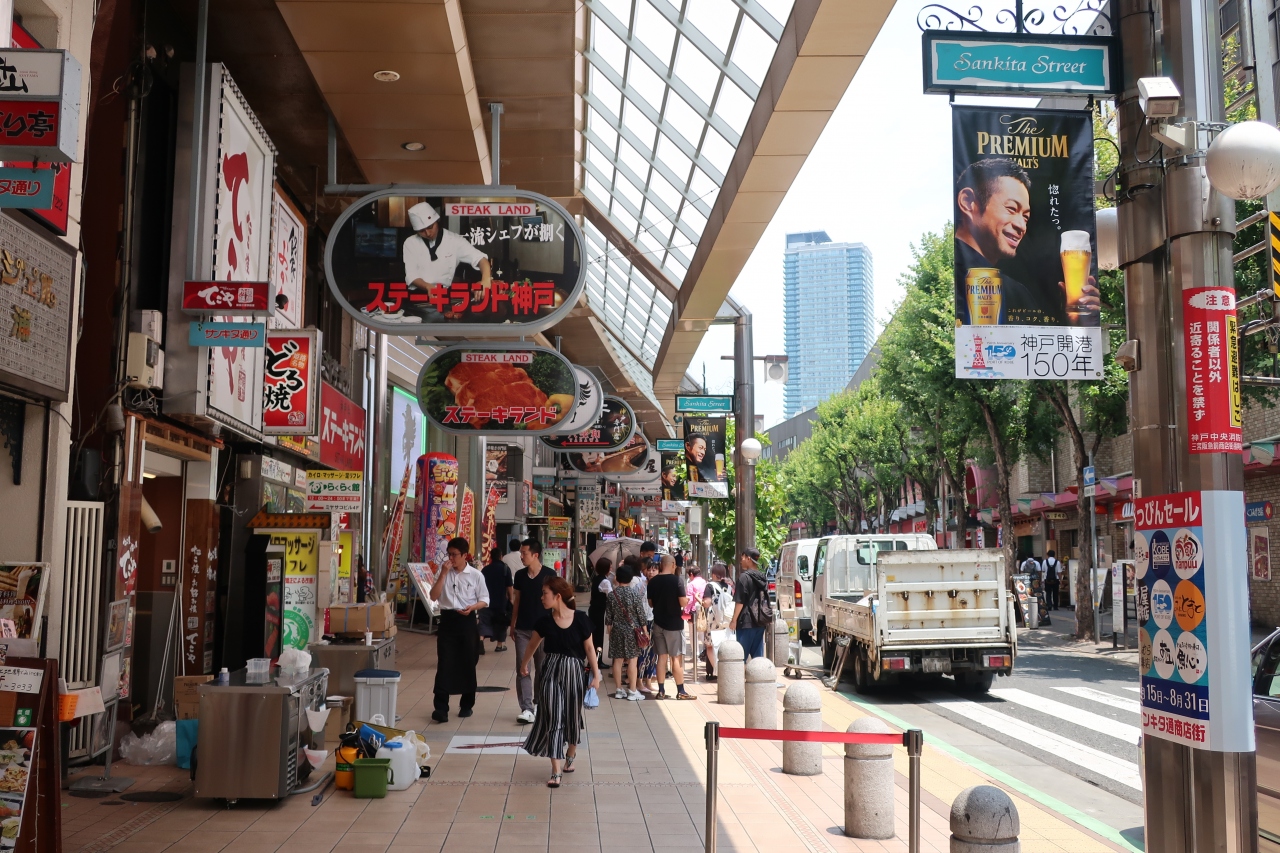 阪急三宮駅の北側にある通称サンキタ通り商店街と呼ばれる商店街が「三宮阪急前商店街」です。斜めにカットされたアーケードが珍しいです。