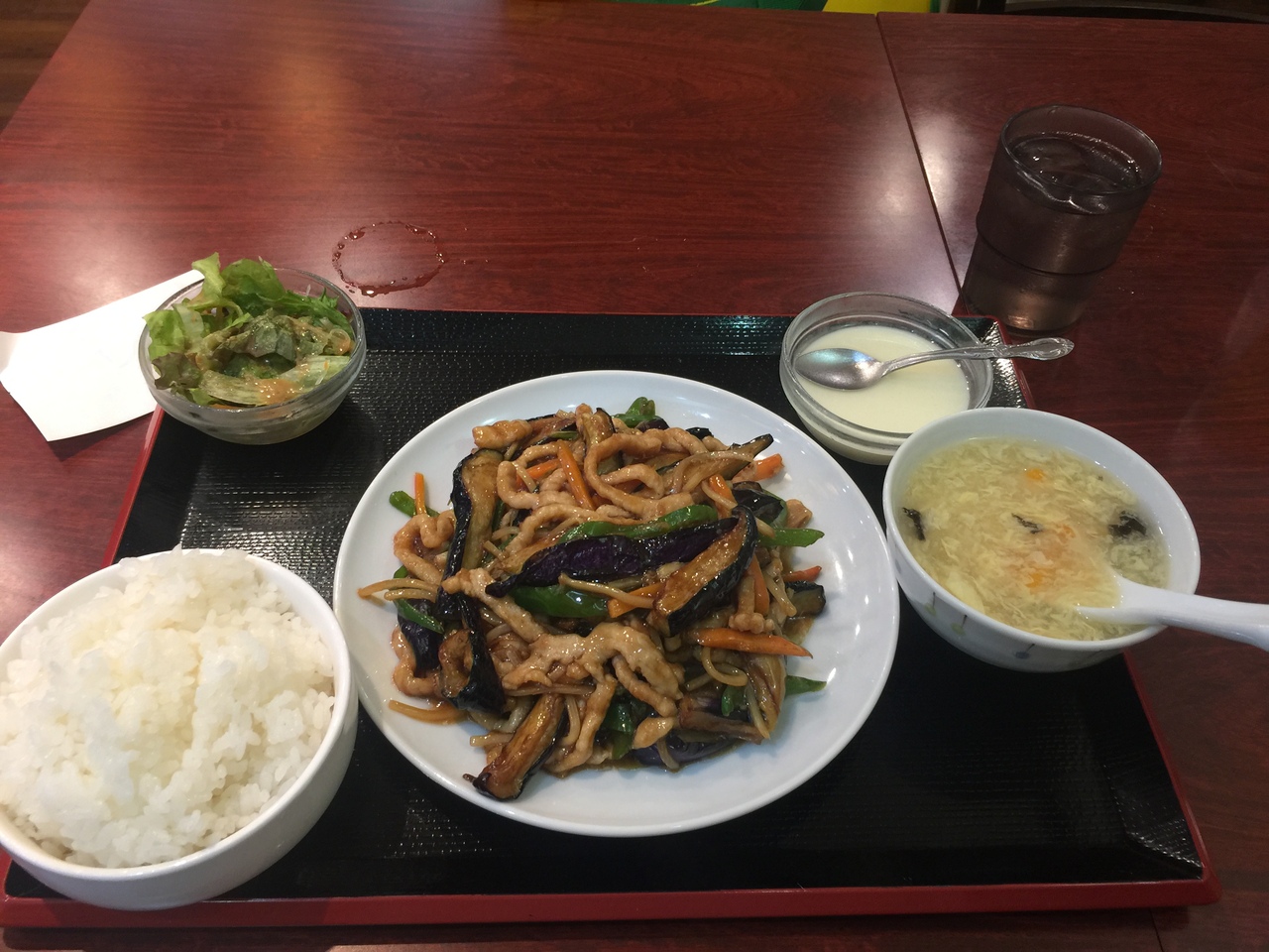 たのんだのは日替わりの豚肉の細切りとナス炒め定食800円!定食をたのむと生ビールが300円でたのめるのでそちらも、、、