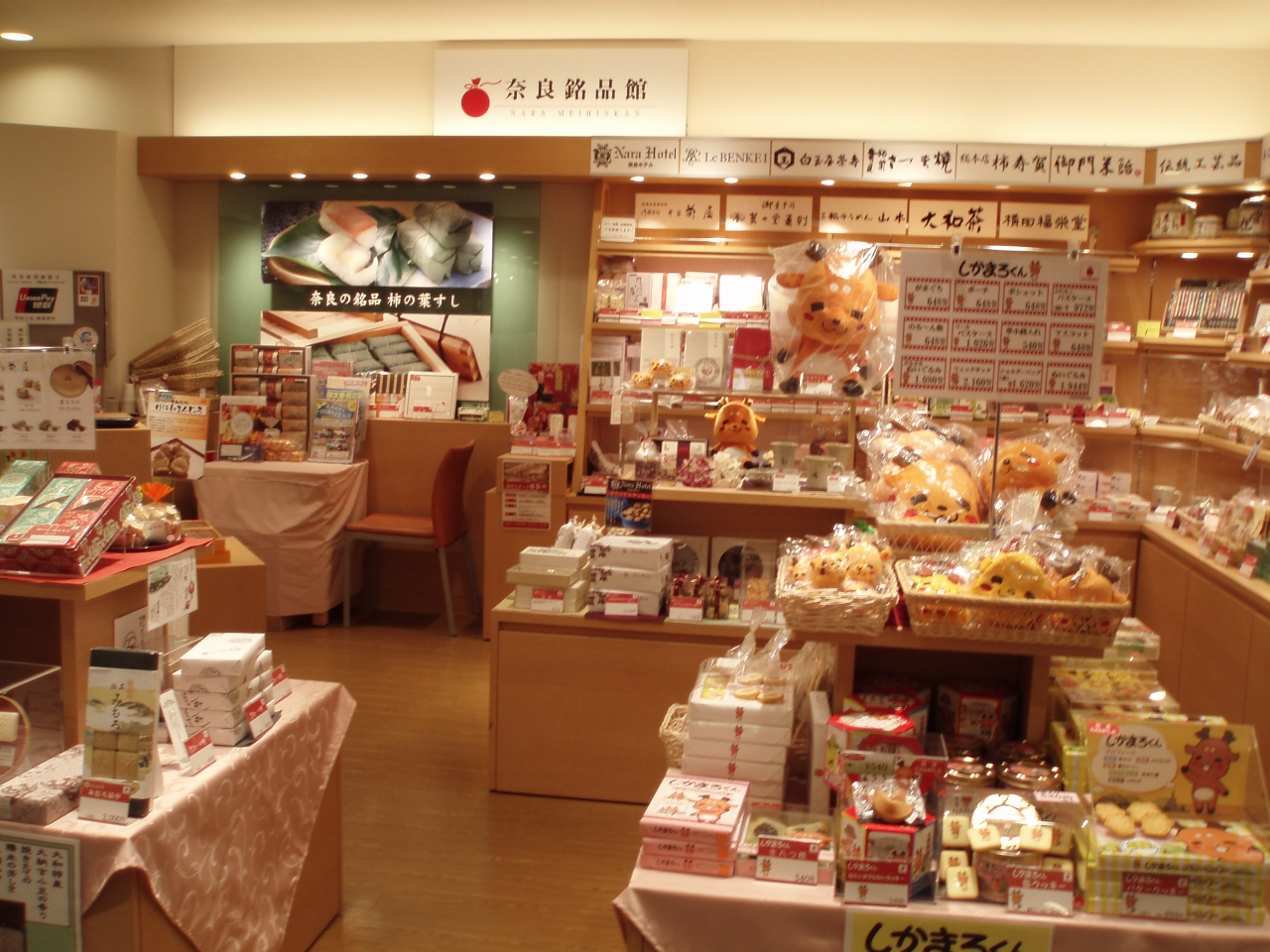 改札のある2階から入ると「柿の葉寿司」「大仏プリン」「天極堂」など奈良名物のお店が多く、飲食やお土産購入に便利です。