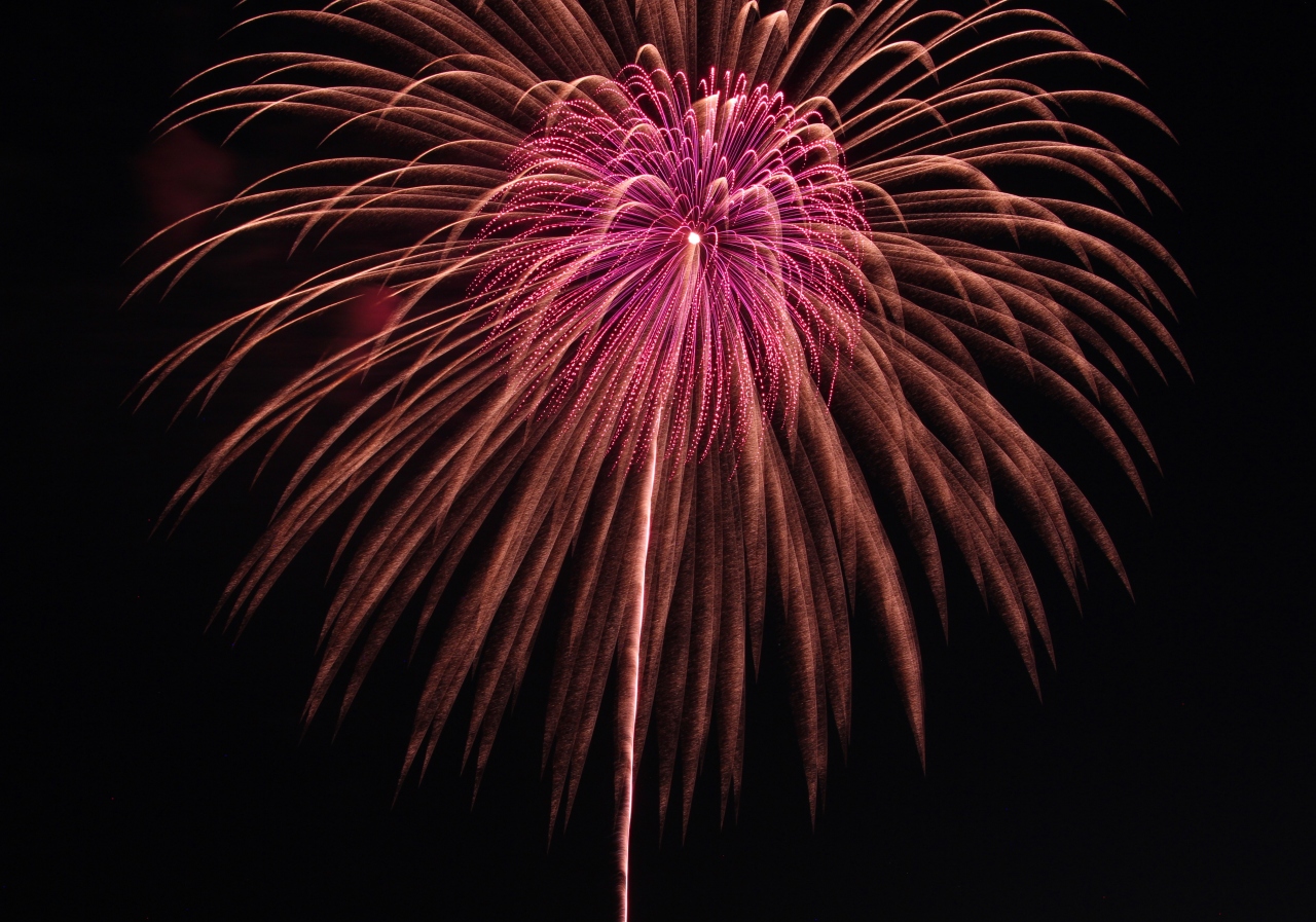 最近の花火はコンピューター制御で連続的にスターマインを打ち上げるので、流れるような軌跡を描くスターマインは、上手くその一瞬を切り取れればインスタ映えする写真となることは間違え無しで、事実、インスタのサイト上でもそのような美しい写真が多くアップされています。