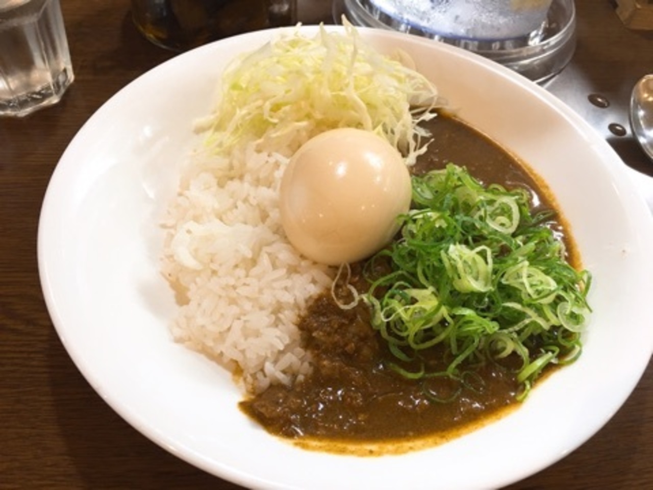 メニューは神戸キーマカレー650円のみ。トッピングは煮たまご100円、ホワイトチーズ100円、ねぎ多め50円(税込)。私はキーマカレーに煮たまごで750円。このねぎは通常の量です。あとキャベツの千切りがのっていて、カレーをかける前に牛スジ肉の煮たのがのっけられます。そしてこちらのすごい所はなんとカレーとご飯とねぎはお代わり自由。