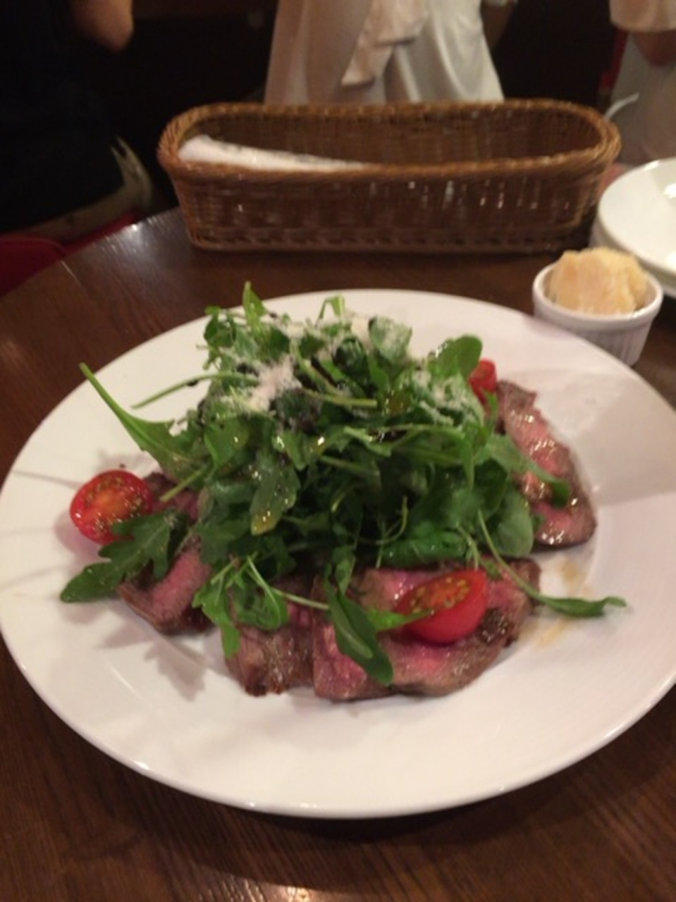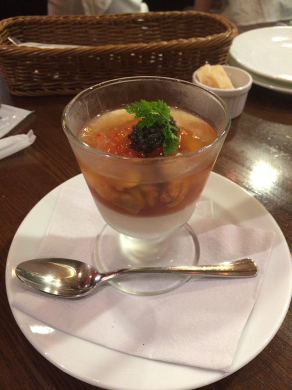 東北に夜行バスで旅立つ前にディナーです。東京駅八重洲南口、八重洲ブックセンターのすぐそばです。19時過ぎ、空いているかなと思いつつ来店。スタンディングのテーブルに案内されました。ワインを飲みたかったけど、ジンジャーレモンに。キャビア、うに、いくら、ほたてえびなどのジェリー寄せ。下の方はムースに。美味しい。和牛モモ肉のサラダ仕立ては、ボリューミーでお腹いっぱい。ちょっと肉は硬め。パスタやピザ、貝のワイン蒸しなんかも食べたかったなぁ。また、来ます。