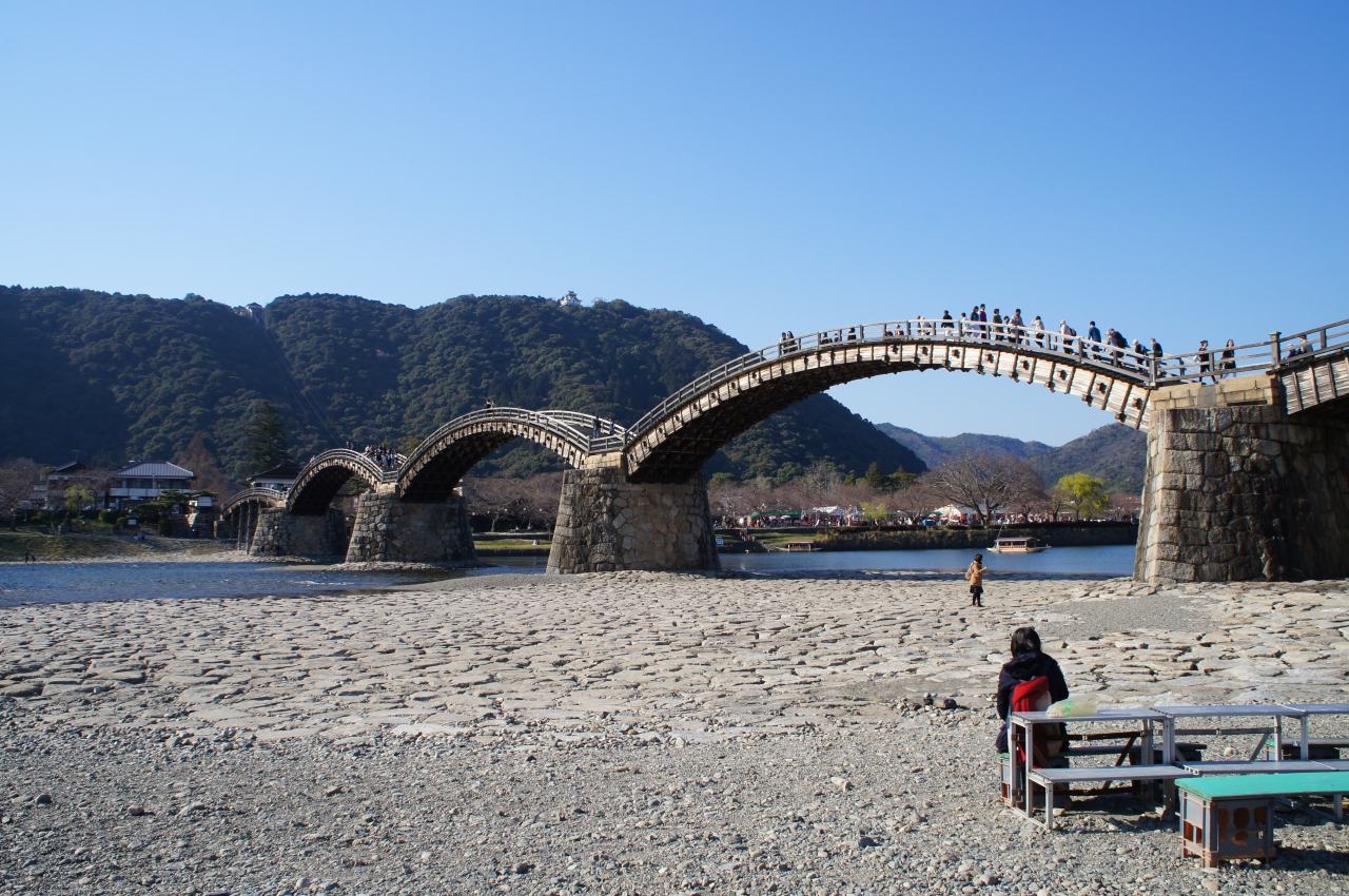 4月初めに友人の車で行きました。満開の桜と橋の素晴らしい景色を期待していたのですが、残念ながら今年は開花が遅くまだちらほら咲きでした。でも木造の五連のアーチ橋は想像をはるかに超えて美しく、真下から見上げた木組みの構造も江戸時代の日本の建築技術の素晴らしさを感じさせるものでした。ヨーロッパの歴史ある石造りの橋も素敵ですが、これはそれにも負けない価値ある橋だと思いました。やはり桜の季節が最高でしょうね。ただし道はかなり渋滞するようですが・・・