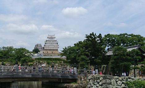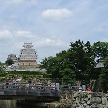 姫路城を見学するには、最初に内堀に架かる桜門橋を渡ることになります。桜門橋は意外と新しく平成19年に完成の木造橋でした。内堀沿いは撮影スポットで、桜門橋と大手門、そして姫路城と一枚の写真に収めることができました。