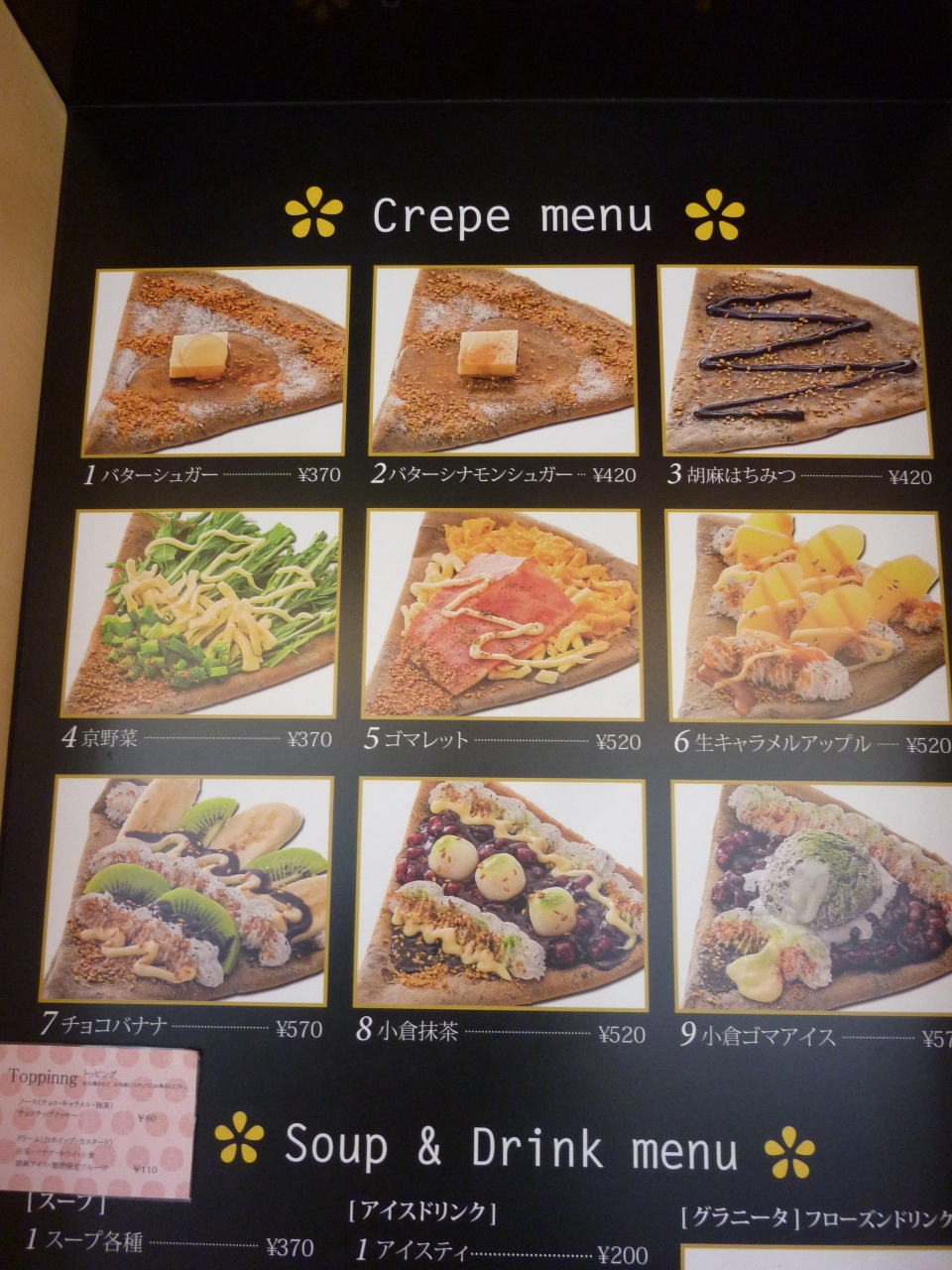 シンプルなモノから、食事系のモノ、そして定番の甘系のモノ、ありとあらゆるクレープを食べる事が出来るお店です。場所は、フードコートからぎりぎり見える場所になっているので、気にしていないと見つけることが出来ないので注意して。そして、こちらが珍しいのが、京野菜を使ったクレープ。とてもヘルシーな味でした。