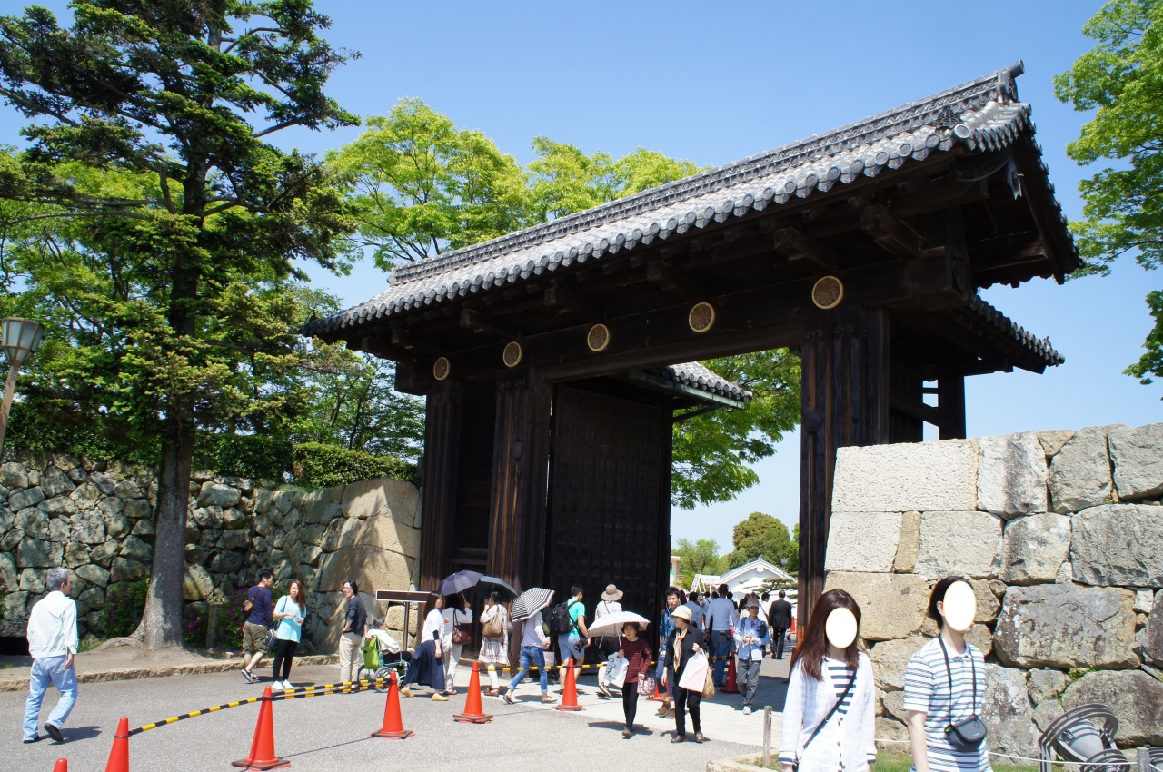 姫路城の入口となる立派で堅牢な門。城の規模の大きさや格式の高さを予感させます。見上げると葵の御紋が金色に輝いており徳川家所縁のお城だと分かります。大手門をくぐると広々した三の丸広場、真正面に白鷺城の全景が見え絶好の写真撮影スポットになっていました。