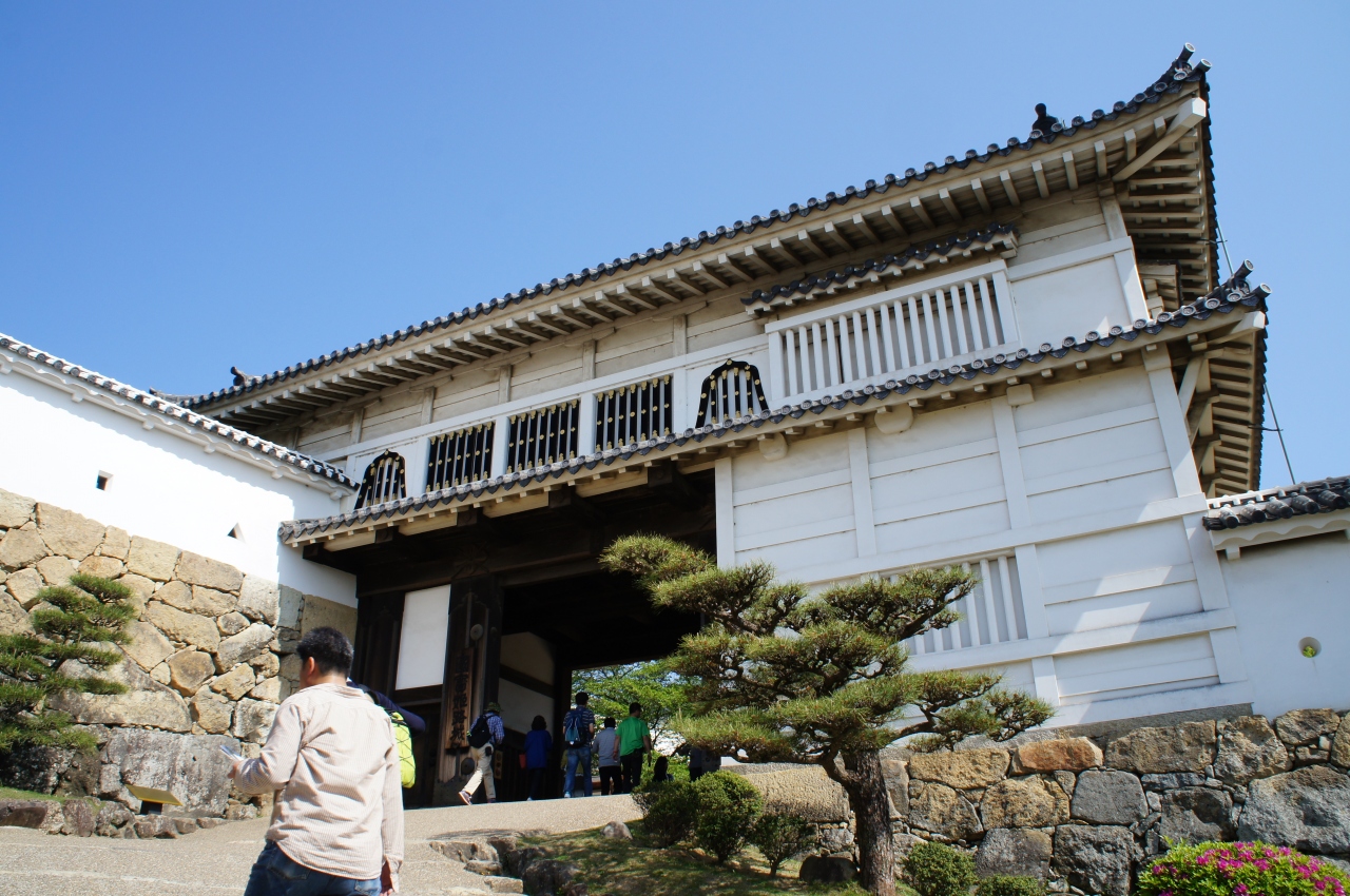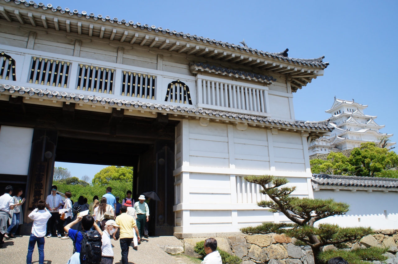 姫路城中核へ入るため最初にくぐる、最も大きく立派な門です。ちょうど上り坂の曲がり角に設けられていて片側が壁になっているアンバランスな構造。敵への防御を意図しての造りでしょう。ただ戦略的なだけではなく、意匠的にとても豪華で美しい造りになっています。白漆喰の壁は美しく、敵の侵入を見張るための格子窓の装飾も華やかで格式を感じさせるものでした。ちょっと立ち止まって見上げてみてはいかがでしょう。