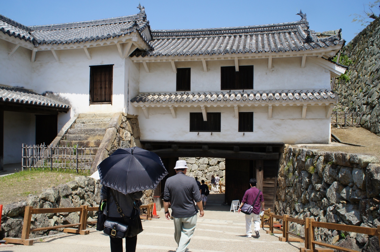 天守見学後「ぬの門」をくぐって二の丸を過ぎると天守見学ルートを一周したことになり、くぐった先には美しい石垣「扇の勾配」があります。門は珍しい2階建て構造で、侵入して来る敵を二重攻撃できるようになっています。また下から天守を目指すと、正面と左側面は石垣になっており、閉鎖的な空間を右折して右側面の門をくぐらなければならないので、とても攻めにくい構造になっていることが分かりました。この門はプライベートに利用されていたそうです。
