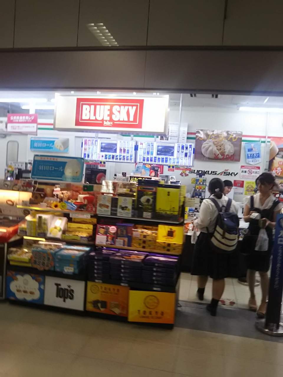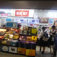 羽田空港の第一ターミナルは日本航空がターミナルとして使っており、こちらのブルースカイのショップがたくさんありまして、お土産やおにぎり、ペットボトルなどの必要品を購入することができます。こちらのお店も簡単なお土産やペットボトル、つまみなどが販売されています。